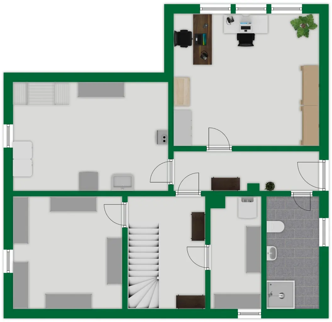 Die Raumaufteilung bietet vielfältige Nutzungsmöglichkeiten. Im Erdgeschoss befinden sich ein großzügiger Wohnbereich mit Kamin, die charmante Küche sowie zwei weitere Zimmer und ein Gäste-WC. Das Dachgeschoss ist voll ausgebaut und bietet zusätzlichen Platz in Form von drei Zimmern und einem Tageslichtbad. Im Keller ist ein praktisches Büro integriert. Zudem gibt es dort ein weiteres Bad, die Waschküche und Abstellräume. Direkt neben dem Büro befindet sich eine Kelleraußentüre.