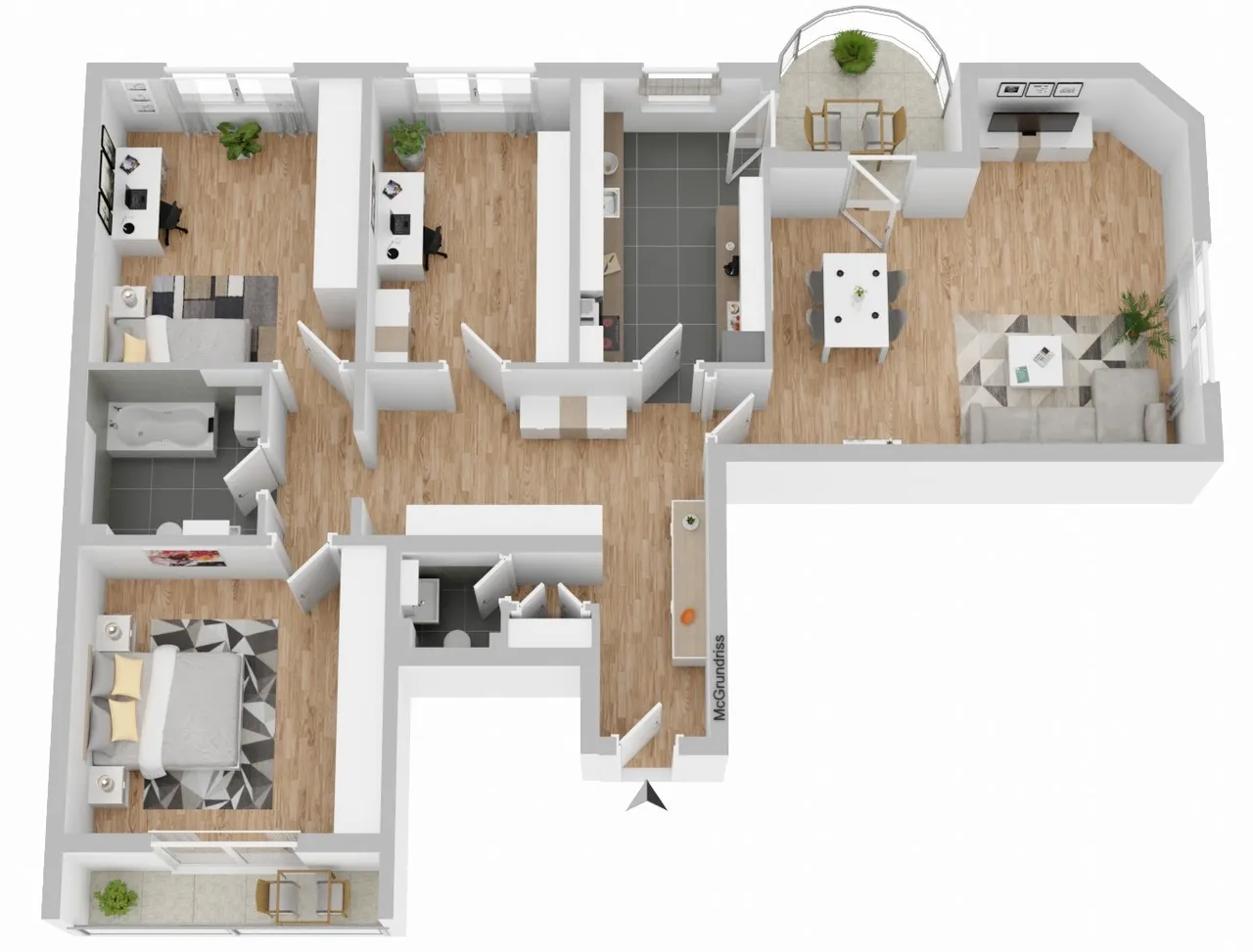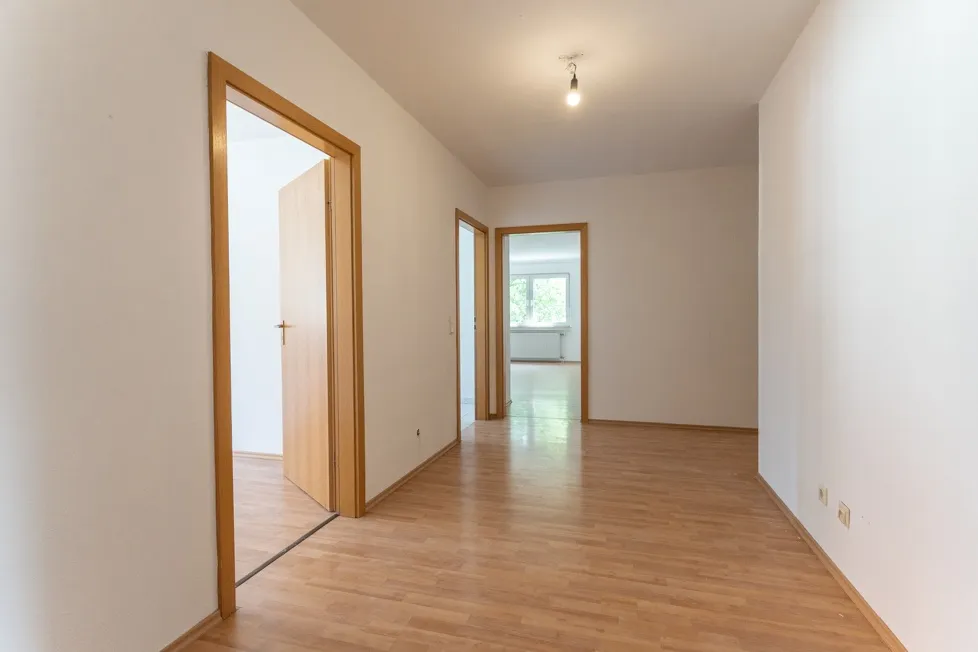 Zwei weitere Schlafzimmer mit ca. 15 m² bzw. 14 m² sowie das Badezimmer mit Badewanne und Waschmaschinenanschluss sind über einen separaten Zwischenflur erreichbar ideal für eine Trennung von Wohn-/ und Schlafbereichen.