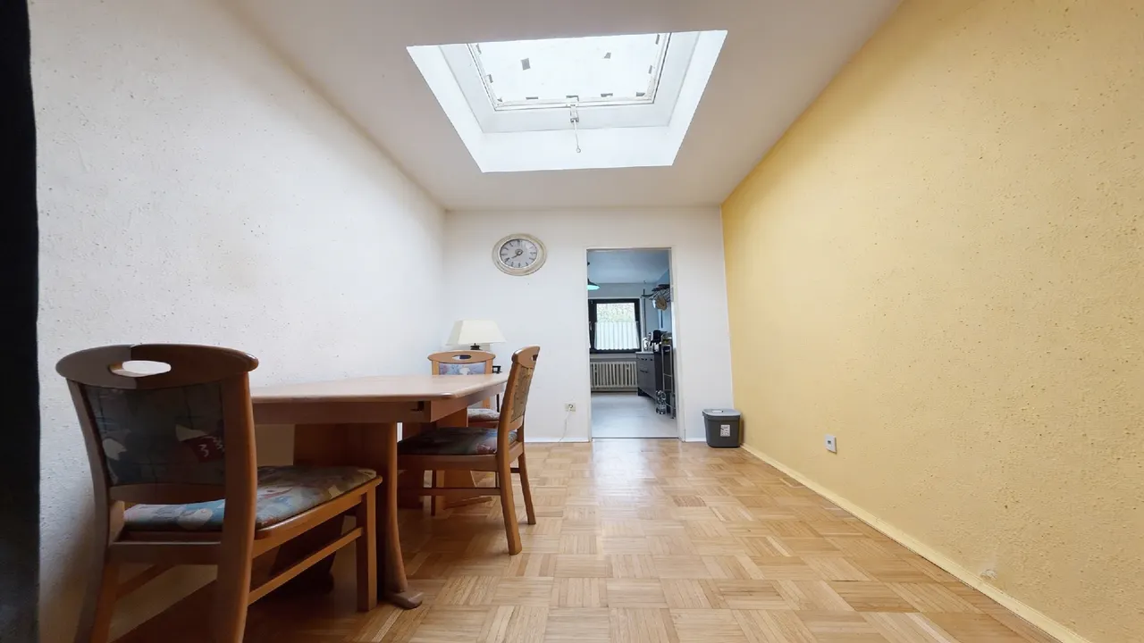 Der Wohnbereich präsentiert sich angenehm großzügig und lichtdurchflutet. Die großen Fenster sorgen für eine freundliche Atmosphäre und bieten vielfältige Einrichtungsmöglichkeiten. Der separate Essbereich mit Dachfenster bringt zusätzliches Tageslicht in die Wohnung und schafft einen schönen Platz für gemeinsame Mahlzeiten.