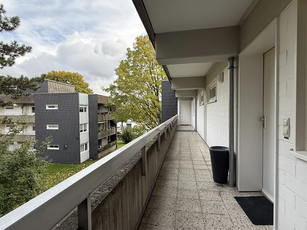 Bereits beim Betreten des Laubengangs genießen Sie den Blick auf das begrünte Grundstück des Wohnhauses.