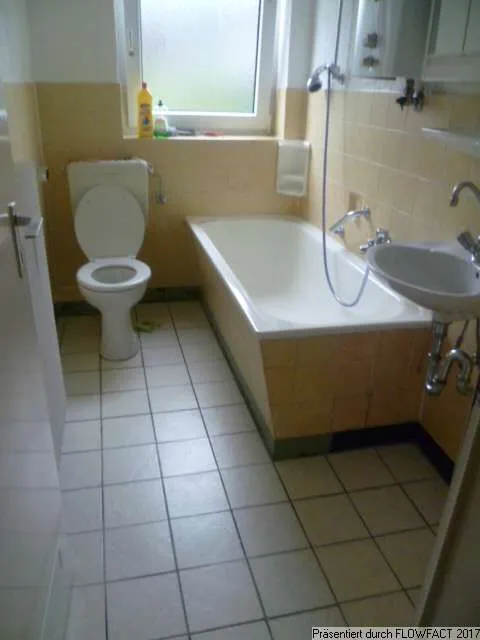 Die Wohnung verfügt über ein Bad, zwei geräumige Schlafzimmer, eine Küche, einen Abstellraum und ein großes Wohn-/Esszimmer mit Balkonzugang. Die Bilder wurden vor dem Einzug der jetzigen Mieter angefertigt.