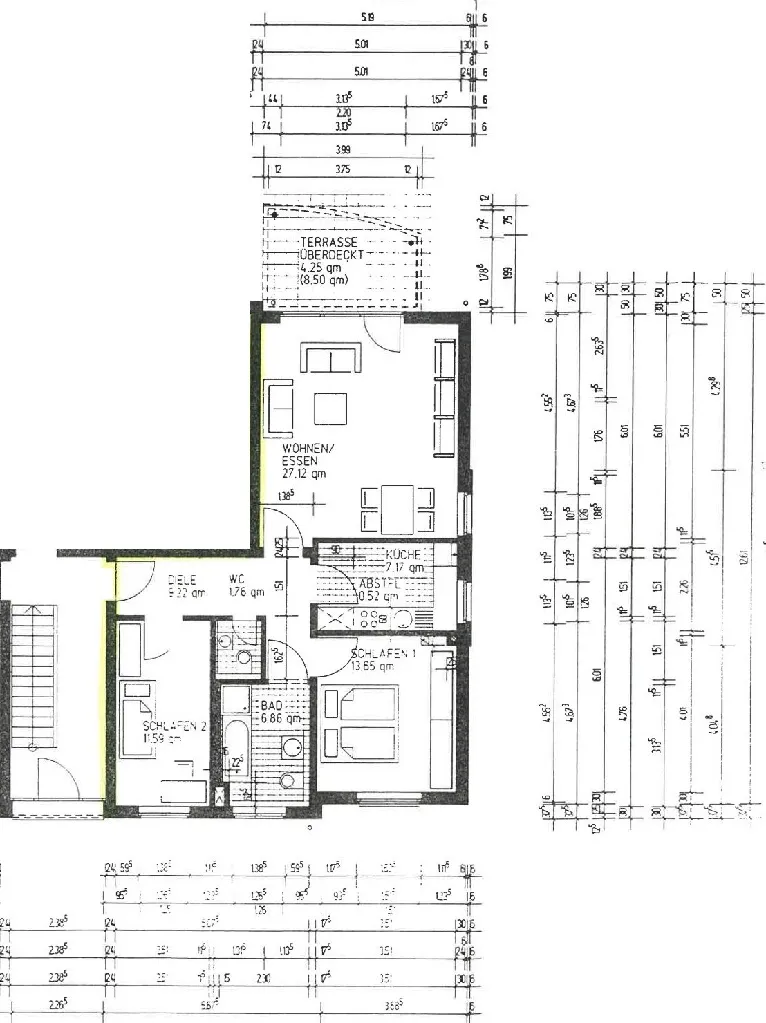 Herzstück der Wohnung ist das ca. 27 m² große Wohn-/ und Esszimmer mit direktem Zugang zur großzügigen, teilüberdachten Terrasse mit Süd-Ost- Ausrichtung.