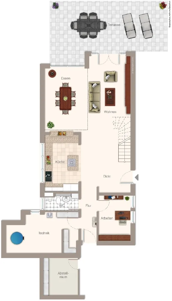 Das Herzstück des Hauses ist das großzügige, lichtdurchflutete Wohnzimmer im Erdgeschoss. Der offene Essbereich lädt zu gemeinsamen Mahlzeiten mit Familie und Freunden ein, während die offene Küche mit ihrer enormen Arbeitsfläche das Herz für kulinarische Kreativität ist. Stellen Sie sich vor, wie Sie hier köstliche Gerichte zubereiten, während die Sonne durch die Fenster strömt und den Raum in ein warmes Licht taucht. Das Arbeitszimmer bietet einen ruhigen Rückzugsort, um kreativ zu sein oder einfach nur zu arbeiten, während das Gäste-WC und der Hauswirtschaftsraum den Alltag angenehm erleichtern.