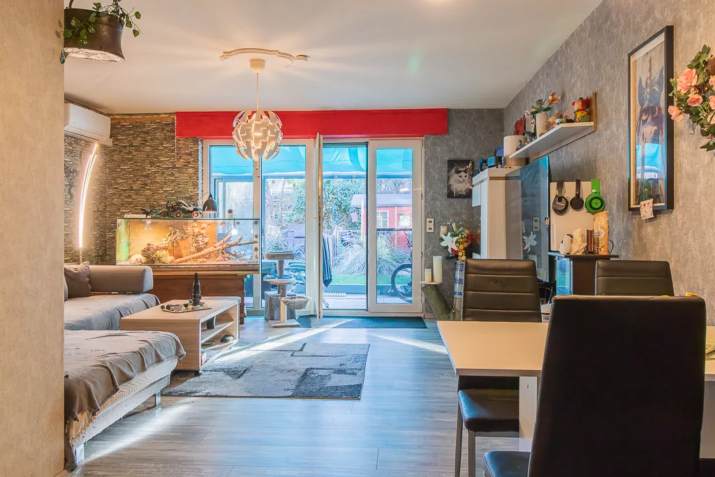 Der Zugang zum Haus führt über eine Stufen in das Erdgeschoss, das sich in eine Diele, ein Gäste-WC, die offene Küche sowie das großzügige Wohnzimmer gliedert. An dieses wurde vor Kurzem ein hochwertiger Wintergarten angebaut, der den Wohnbereich erweitert und ein lichtdurchflutetes Ambiente schafft.