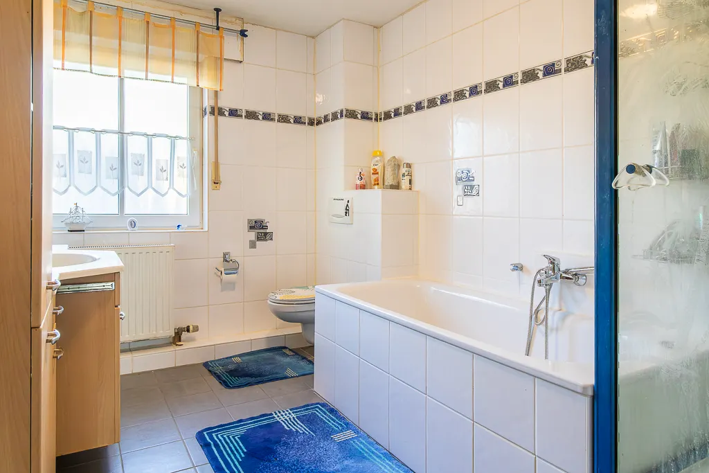 Massivbauweise / Dachstuhl aus Holz mit Isolierung und Betondachsteineindeckung / Weiße Wanne / Außenwände Kalksandstein oder Beton, überwiegend verklinkert / Innenwände überwiegend Kalksandstein oder Beton / Gaszentralheizung 2018 erneuert / isolierverglaste blaue Kunststofffenster / an allen Fenstern Rollläden, überwiegend elektrisch / Klimaanlage im Wohnzimmer eingebaut / blaue Kunststoffhaustüre / Innentüren Holztüren in Stahlzargen / Fußboden: Fliesen und Laminat