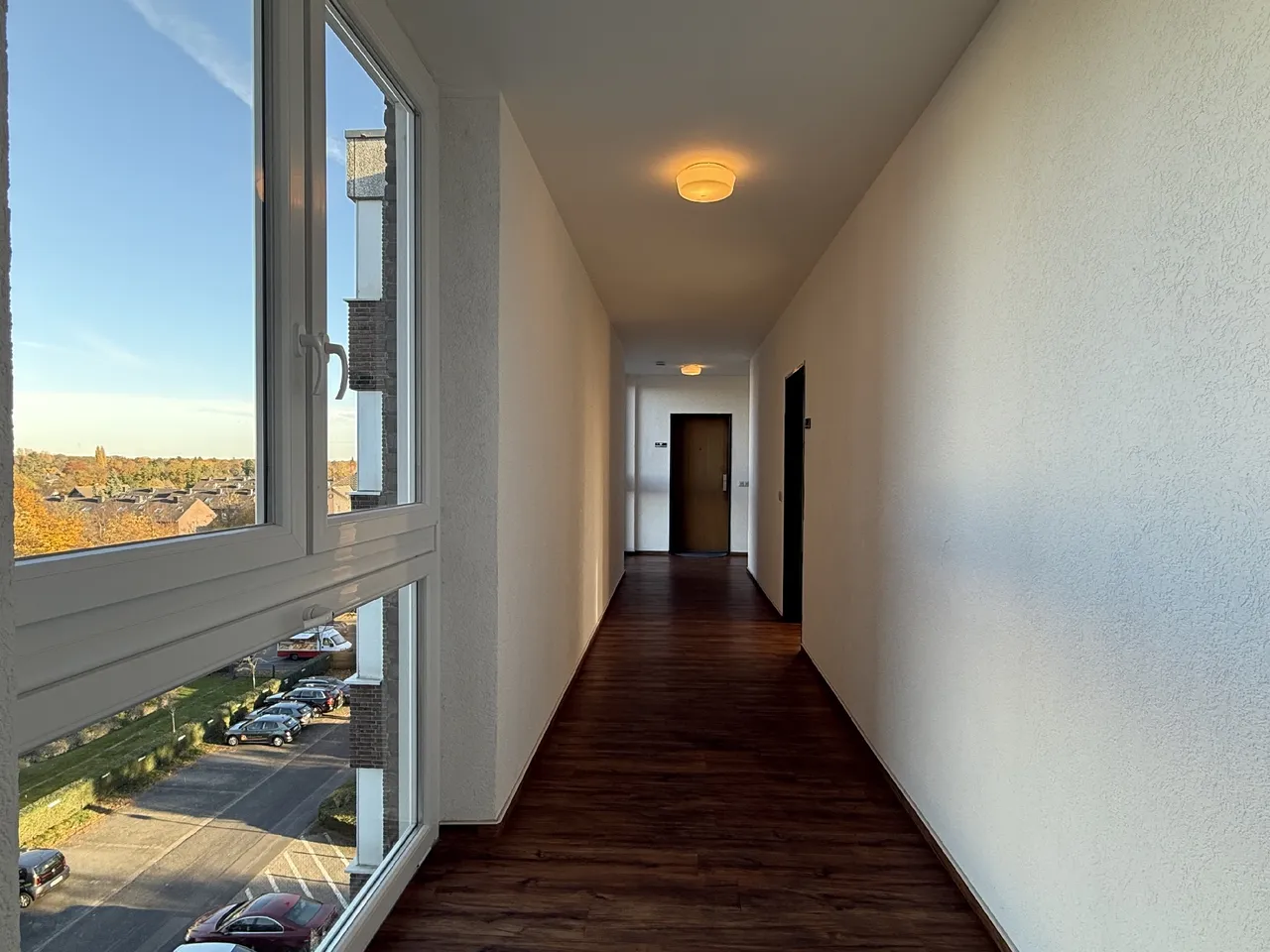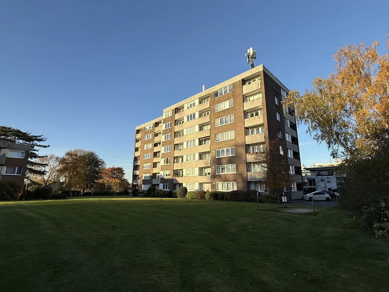 Bereits beim Betreten des Grundstücks empfängt Sie ein äußerst gepflegtes und durchdachtes Erscheinungsbild dieser Immobilie. Die neue Haustür- und Klingelanlage des ursprünglich um 1973 errichteten Gebäudes vermittelt ein modernes Wohngefühl. Saubere Mülltonnenanlagen, Abstellmöglichkeiten für Fahrräder und eine Rampe, mithilfe welcher Sie die 5 Stufen zum Haus auch barrierefrei überwinden können, bilden den ersten Eindruck. Ihre Wohnung im 5. Obergeschoss erreichen Sie sowohl über das helle und breite Treppenhaus, als auch mit dem kürzlich erneuerten Aufzug. Auf Ihrer Etage führt ein separater Flur für 4 Wohnungen Sie zu Ihrem Eingang.