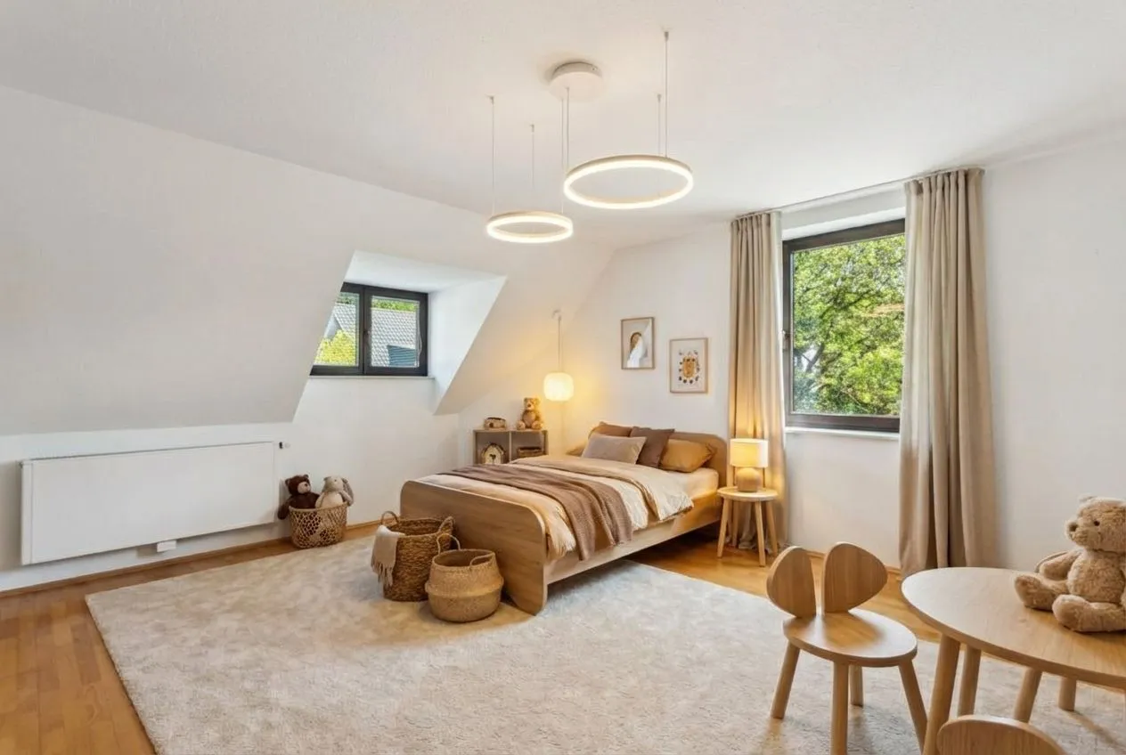Im Obergeschoss stehen drei Schlafzimmer zur Verfügung, die jeweils über einen eigenen Zugang zu einem Badezimmer verfügen. Ein seltener Komfort, der den Wohnwert deutlich erhöht. Zusätzlich ist ein Ankleidezimmer vorhanden, das an eines der Schlafzimmer anschließt.