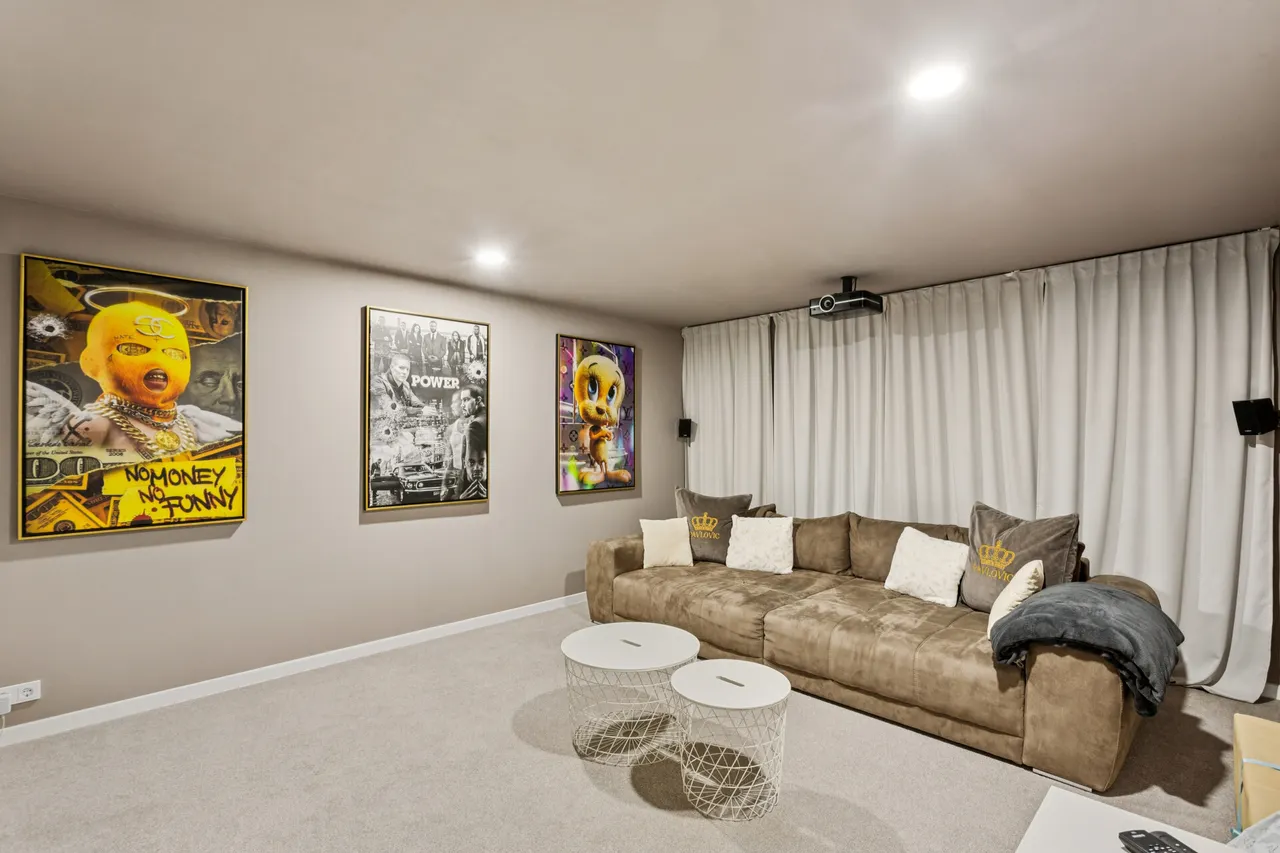 Besonders hervorzuheben ist die exklusive Design-Küche, ausgestattet mit modernster Premium-Technik. Das Quooker Pro 3 System liefert auf Knopfdruck gefiltertes, sprudelndes, kochendes oder normales Trinkwasser und setzt ein klares Highlight im täglichen Komfort. Ebenso beeindruckend ist das hauseigene Heimkino, das unvergessliche Filmabende garantiert.