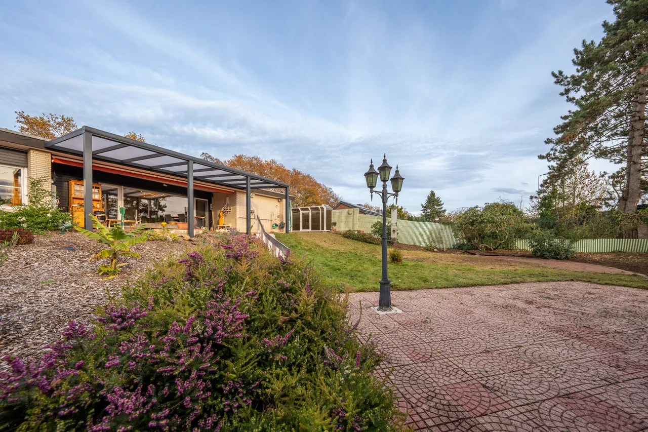 Der gepflegte Garten mit überdachter Terrasse ist ein Ort zum Durchatmen – hier können Sie die Natur genießen, Feste feiern oder einfach die Seele baumeln lassen.