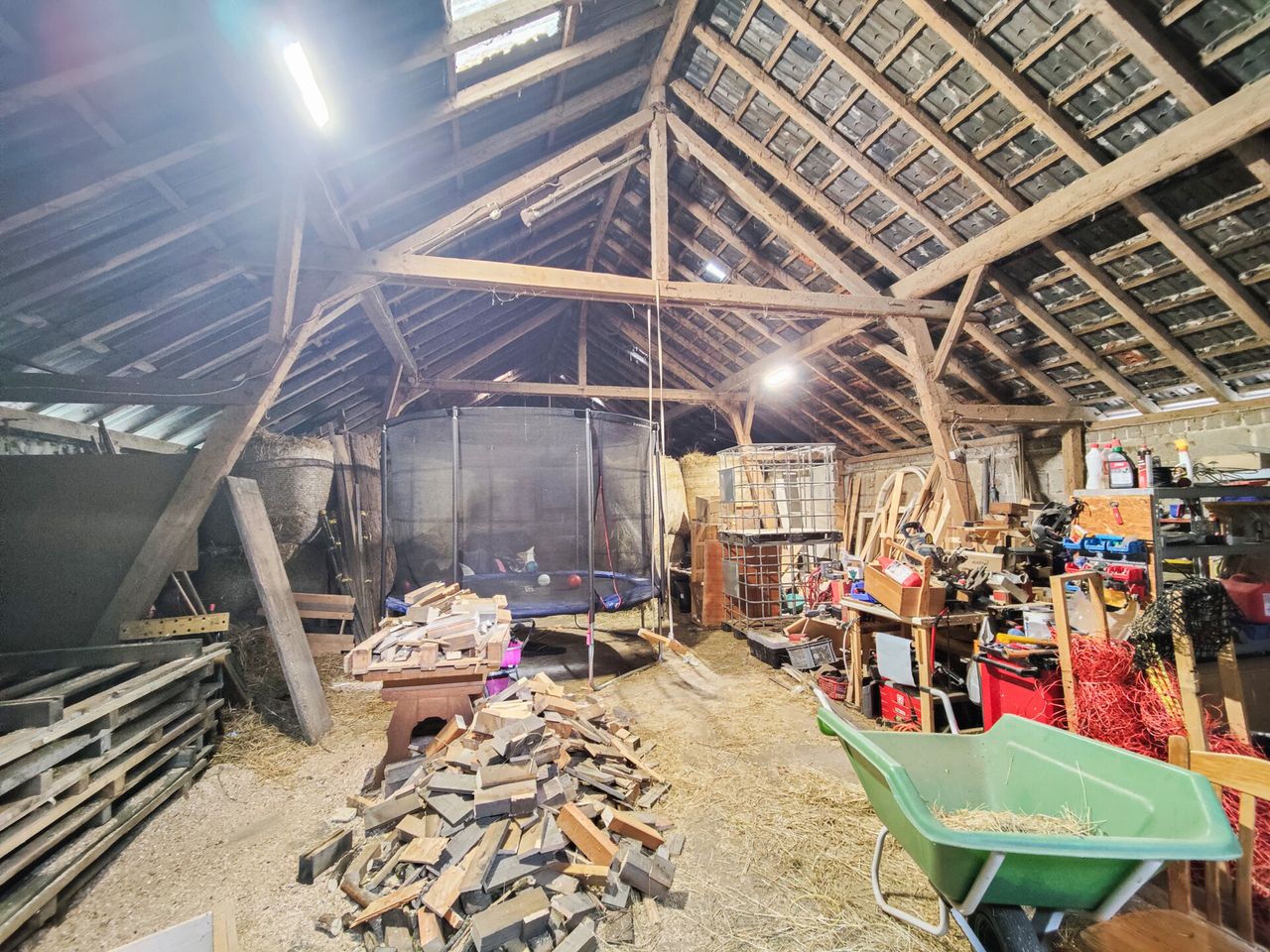An das Wohnhaus grenzt ein großes Stallgebäude mit darüberliegender Scheune. Den Stall erreicht man auf kurzem Wege über einen Gang mit weiteren Lagerräumen. Hier befindet sich auch der Zugang zum alten Bruchsteinkeller.