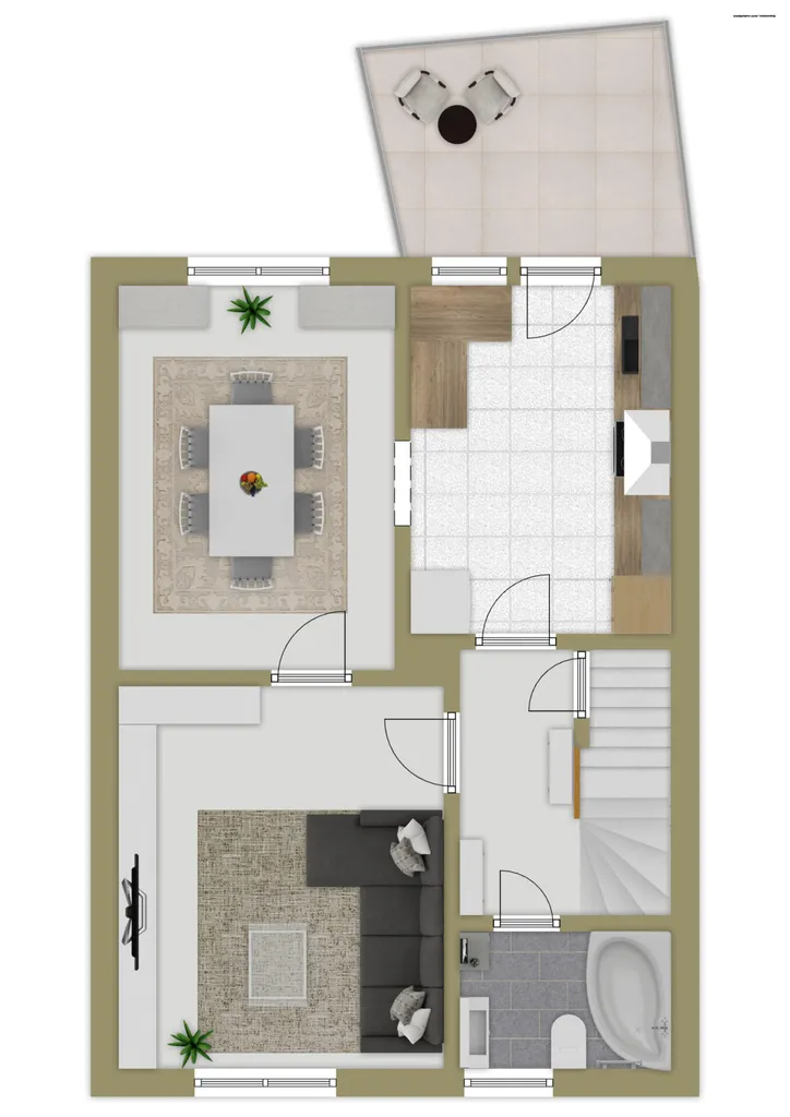 - 2. Obergeschoss (ca. 49 m²): Tageslichtbad mit Eckbadewanne, Wohn- und Essbereich, Küche, Zugang zur