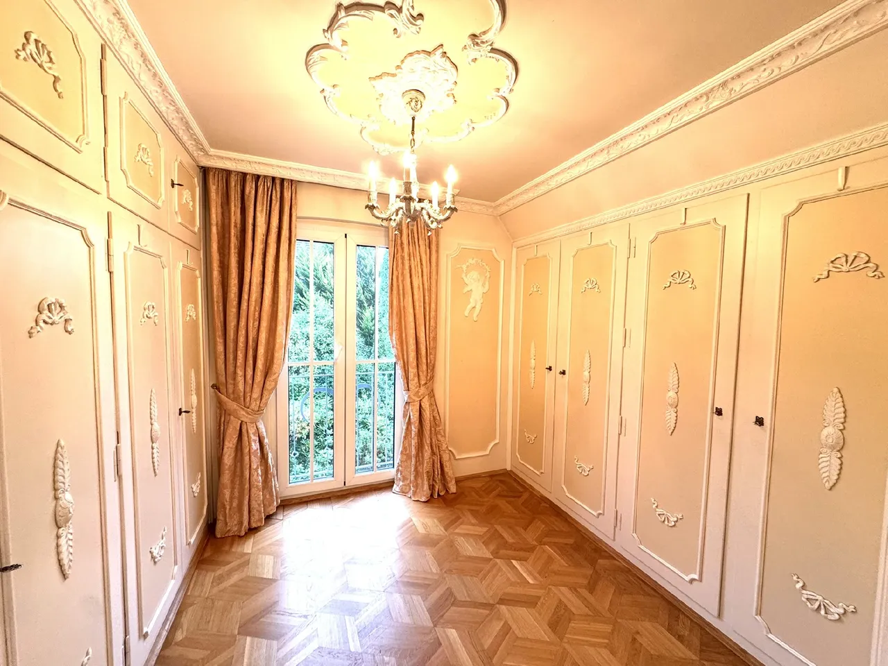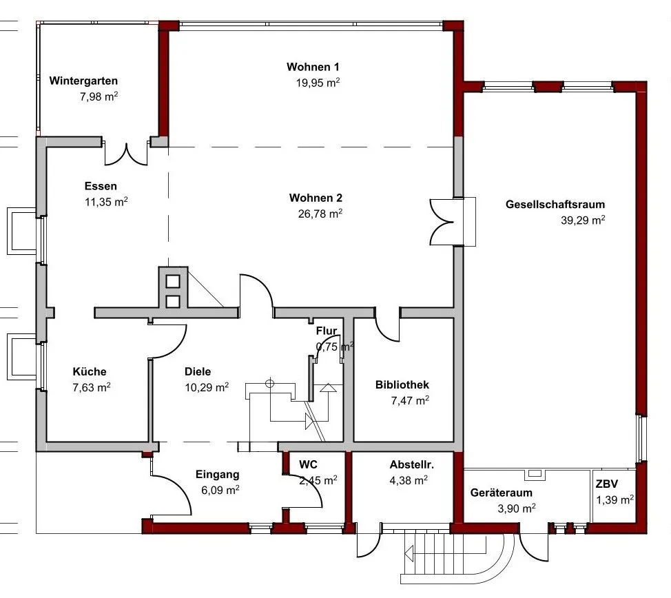 Im Erdgeschoss erwartet Sie ein großzügiger Wohn-/Essbereich, der durch seine offene Gestaltung besticht. Angrenzend befindet sich eine kleine Bibliothek, die Raum für Ruhe und Inspiration bietet. Der sonnige Wintergarten erweitert den Wohnbereich harmonisch und eröffnet einen wunderbaren Blick in den Garten. Die kleine Einbauküche und das Gäste-WC ergänzen das Raumangebot. Ein großes Nebenzimmer eröffnet zusätzliche Möglichkeiten: So könnte der Raum z.B. zu einem komfortablen Eltern-Schlafzimmer mit Ankleidebereich und Bad en Suite umgebaut werden.