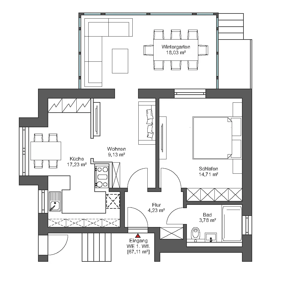 Das Herzstück? Ganz klar: der großzügige Wintergarten mit rund 18 m². Ein Raum zwischen drinnen und draußen – für Pflanzen, Bücher, Gespräche, Abende bei Kerzenschein. Und direkt daneben: Deine Terrasse mit Gartenanteil. Eine kleine grüne Oase mit gemütlicher Loungeecke, in der die Zeit gern mal stillsteht.