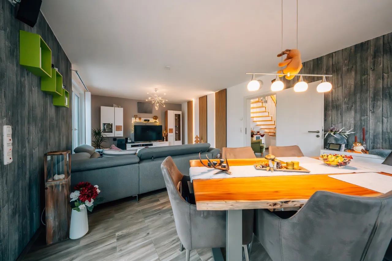 Einladender Eingangsbereich mit offener Holztreppe und freundlicher Atmosphäre
