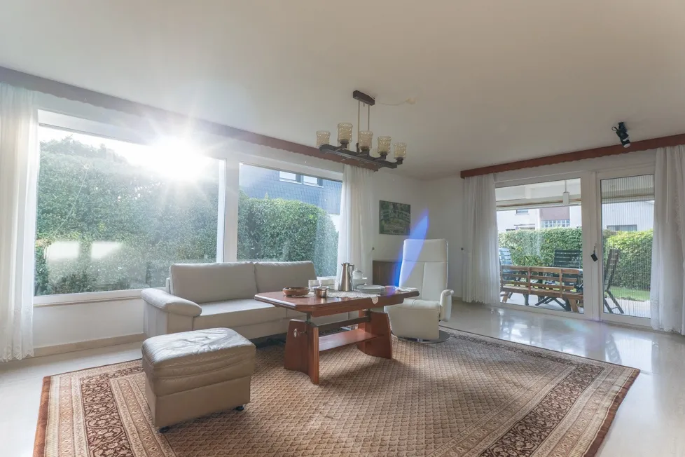 Sowohl vom Wohn-/ als auch vom Esszimmer aus kann auf die teilüberdachte Terrasse und in den Garten gelangen. Der liebevoll angelegte Garten ist von einer Hecke umschlossen und bietet Ihnen ein hohes Maß an Privatsphäre. Die großzügige, ebene Rasenfläche schafft ideale Voraussetzungen für spielende Kinder oder entspannte Stunden im Grünen. Die teilüberdachte Terrasse mit attraktiver Süd-West-Ausrichtung erweitert den Wohnraum nach außen und lädt zu sonnigen Nachmittagen und geselligen Abenden ein.
