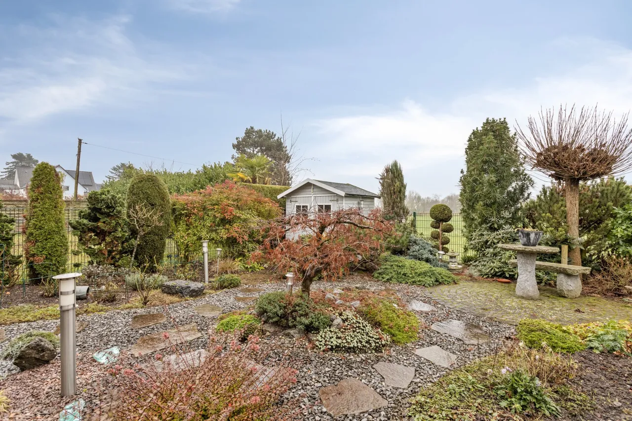 Der liebevoll angelegte Garten in Südlage lädt zum Entspannen und Spielen ein. Neben einer Garage und einem große überdachten Eingangsbereich, steht auch eine Fahrradgarage zur Verfügung. Ein Gartenhaus bietet zusätzlichen Stauraum für Gartengeräte.
