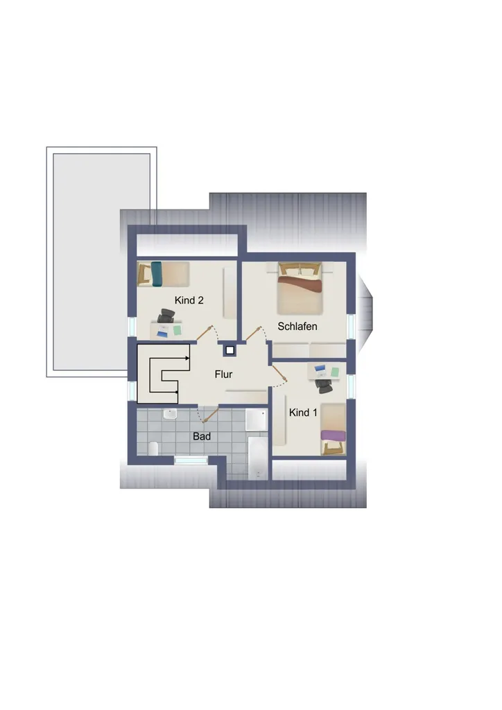 Im Dachgeschoss des Hauses befinden sich drei Schlafzimmer, die ausreichend Platz für Büro und Familie bieten. Das geflieste Tageslichtbad ist mit einer Badewanne und Dusche ausgestattet, was Komfort und Funktionalität vereint. Der Spitzboden ist wohnlich ausgebaut und bietet Platz als Kinder-/oder Hobbyzimmer. Ohne den ausgebauten Spitzboden verfügt die Immobilie über ca. 120 m² Wohnfläche.