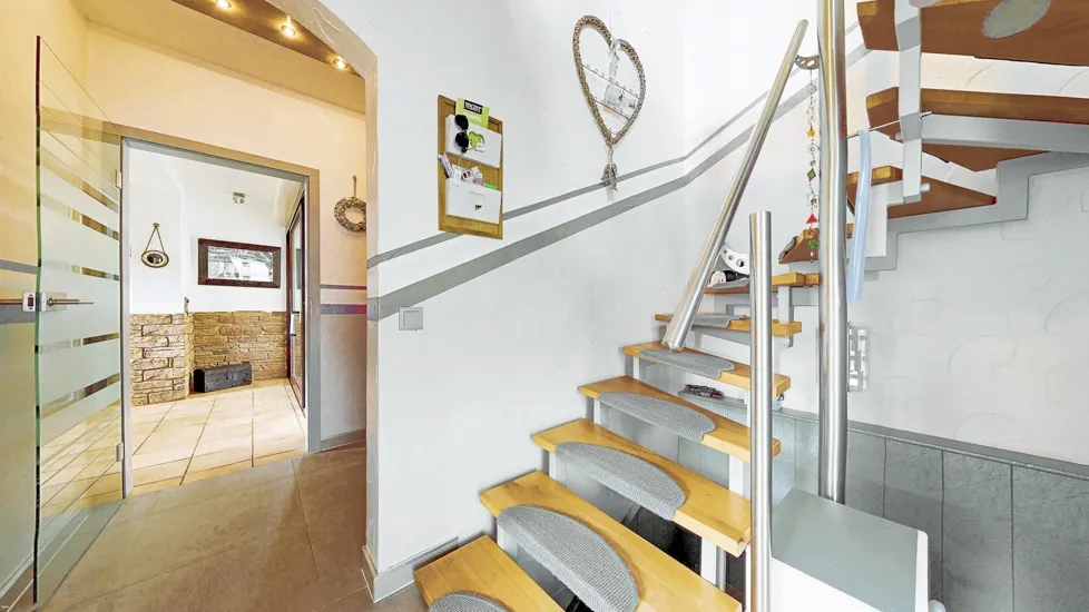 Geschosstreppen: Haupthaus: Zum Keller massiv mit Fliesenbelag, zum OG Stahlkonstruktion mit Holzstufen und Edelstahlgeländer