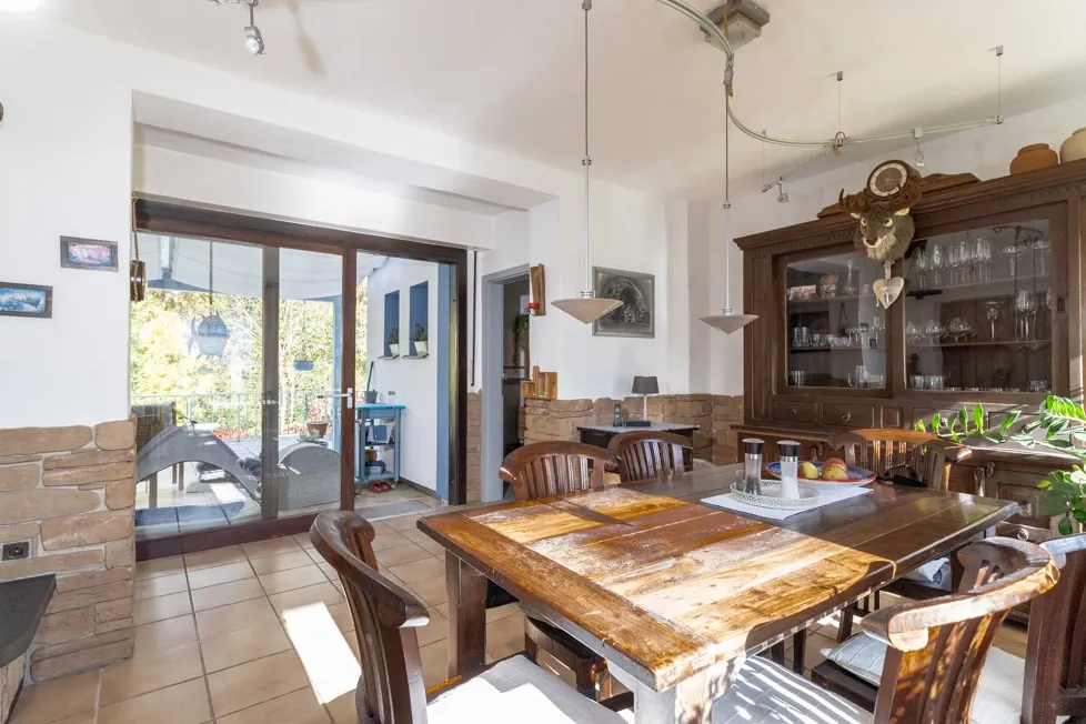 Rechts vom Haus, neben dem Zugang des Haupthauses, gelangen Sie über wenige Stufen in den Garten sowie zum Anbau. Der Anbau befindet sich auf der Garteneben mit eigenem Zugang und bettet sich zwischen einem liebevoll angelegten Fischteich mit Wasserlauf und dem weiteren Gartenbereich ein. Der Anbau lässt sich als separate Einliegerwohnung nutzen. Dieser verfügt über zwei hintereinander liegende Zimmer, ein kleines Badezimmer mit Dusche und eine kleine Küche.