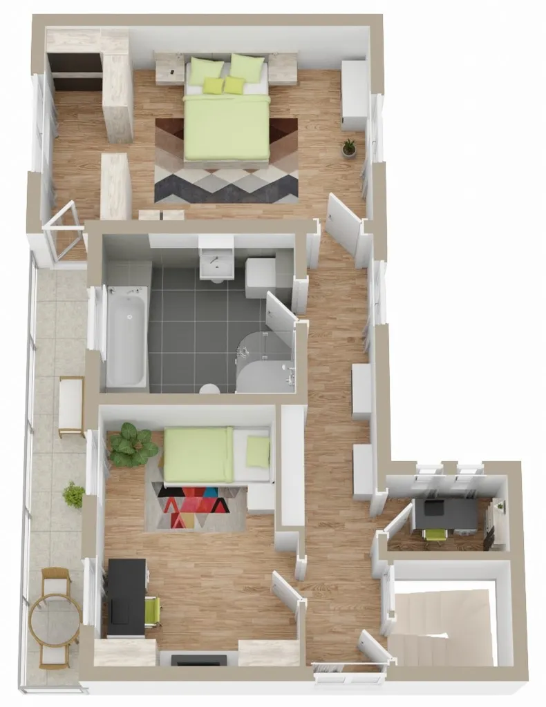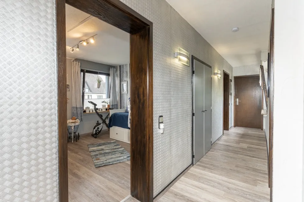 Im Obergeschoss gelangen Sie links vom Flur in ein Kinder-/ oder Arbeitszimmer. Daneben befindet sich das großzügige modernisierte Tageslichtbad mit Badewanne und Glasdusche. Geradeaus gelangen Sie in das Elternschlafzimmer. Einbauschränke grenzen eine begehbare Ankleide sowie den Zugang zu dem Balkon ab.
