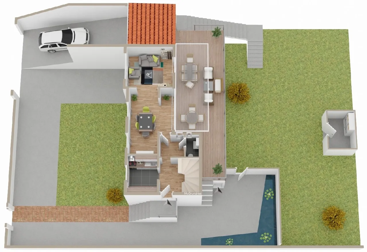 Im Erdgeschoss gelangen Sie zunächst in einen Vorflur mit Treppe zum Keller- / und Obergeschoss. Links vom Eingang befindet sich die moderne Küche. Im Garderobenflur rechts liegt die Gäste WC mit Fenster. Eine Glastür trennt den Flur vom großzügigen offen gestalteten Wohn-/ Essbereich ab. Ein offener Kamin sorgt hier für eine angenehme Wohlfühlatmosphäre. Über ein großes Schiebetürelement öffnet sich der Zugang zur großen Terrasse, die durch eine zusätzliche Teilüberdachung mit Lichtstegplatten Schutz vor Regen und zusätzlich Sonnenschutz bietet. Von der Terrasse aus genießen Sie den Blick in den gepflegten Garten mit Gartenhaus.