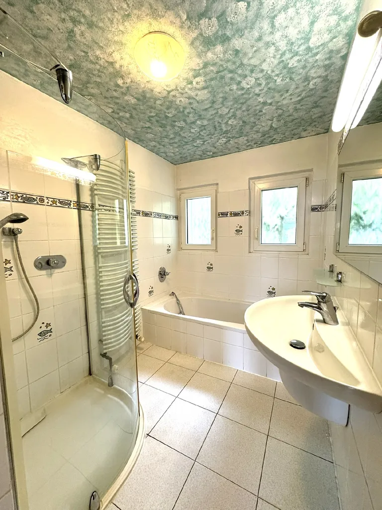 - hell gefliestes Tageslichtbad im Obergeschoss, ausgestattet mit Badewanne, Dusche, Waschtisch und WC