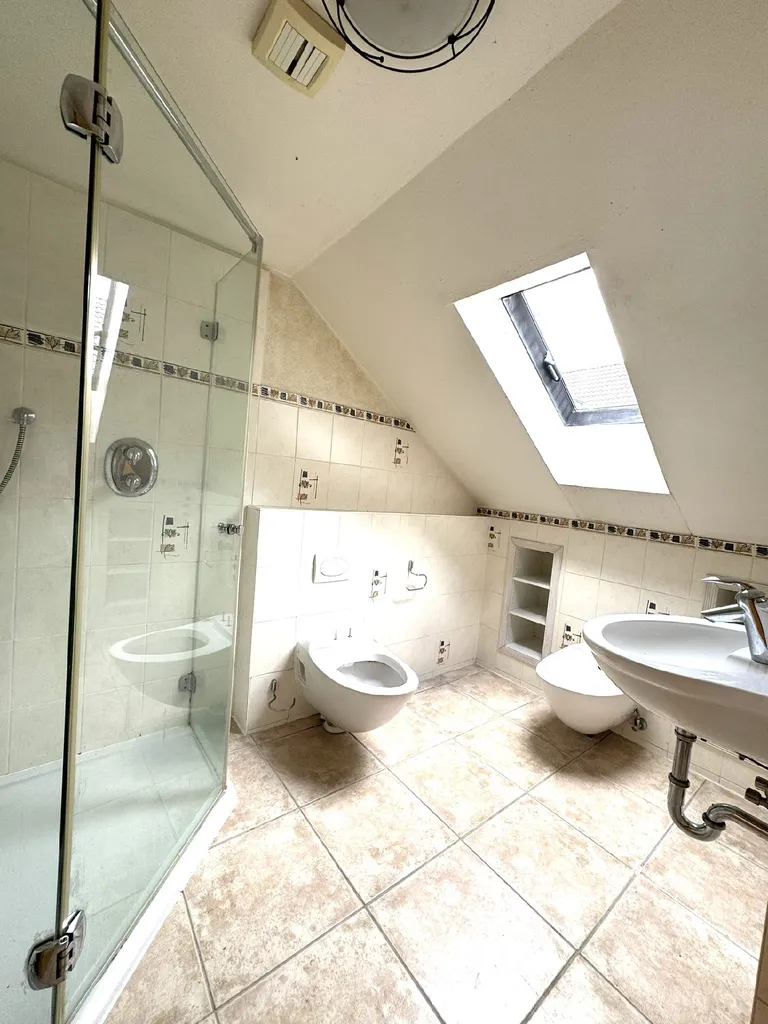 - hell gefliestes Tageslichtbad im Dachgeschoss, ausgestattet mit Dusche, Waschtisch und WC