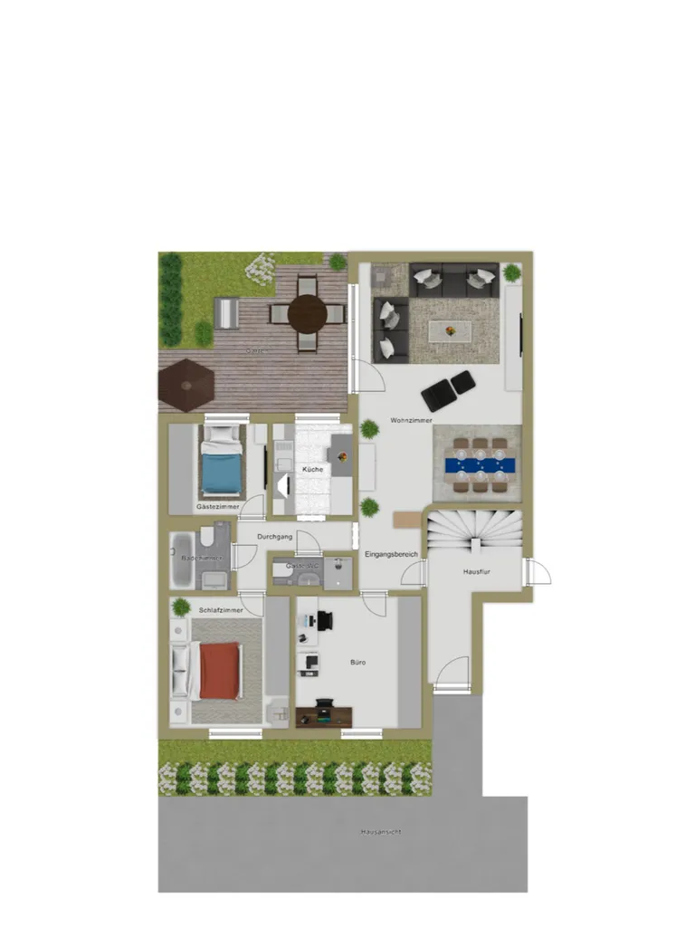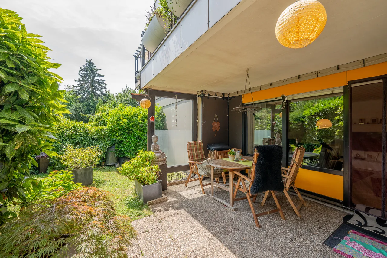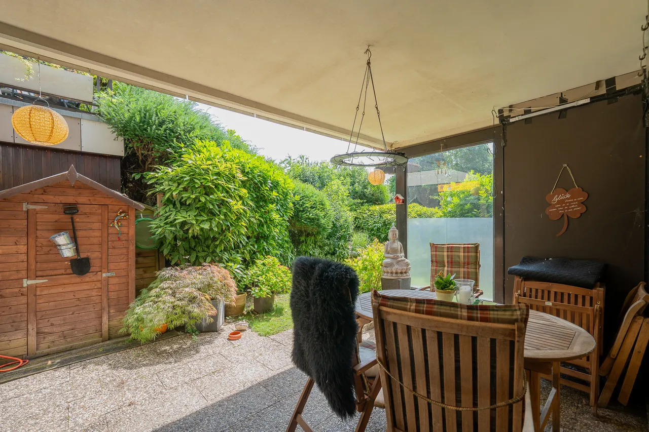 - Überdachte Terrasse mit Blick ins Grüne – Ihr geschützter Rückzugsort im eigenen Gartenparadies.