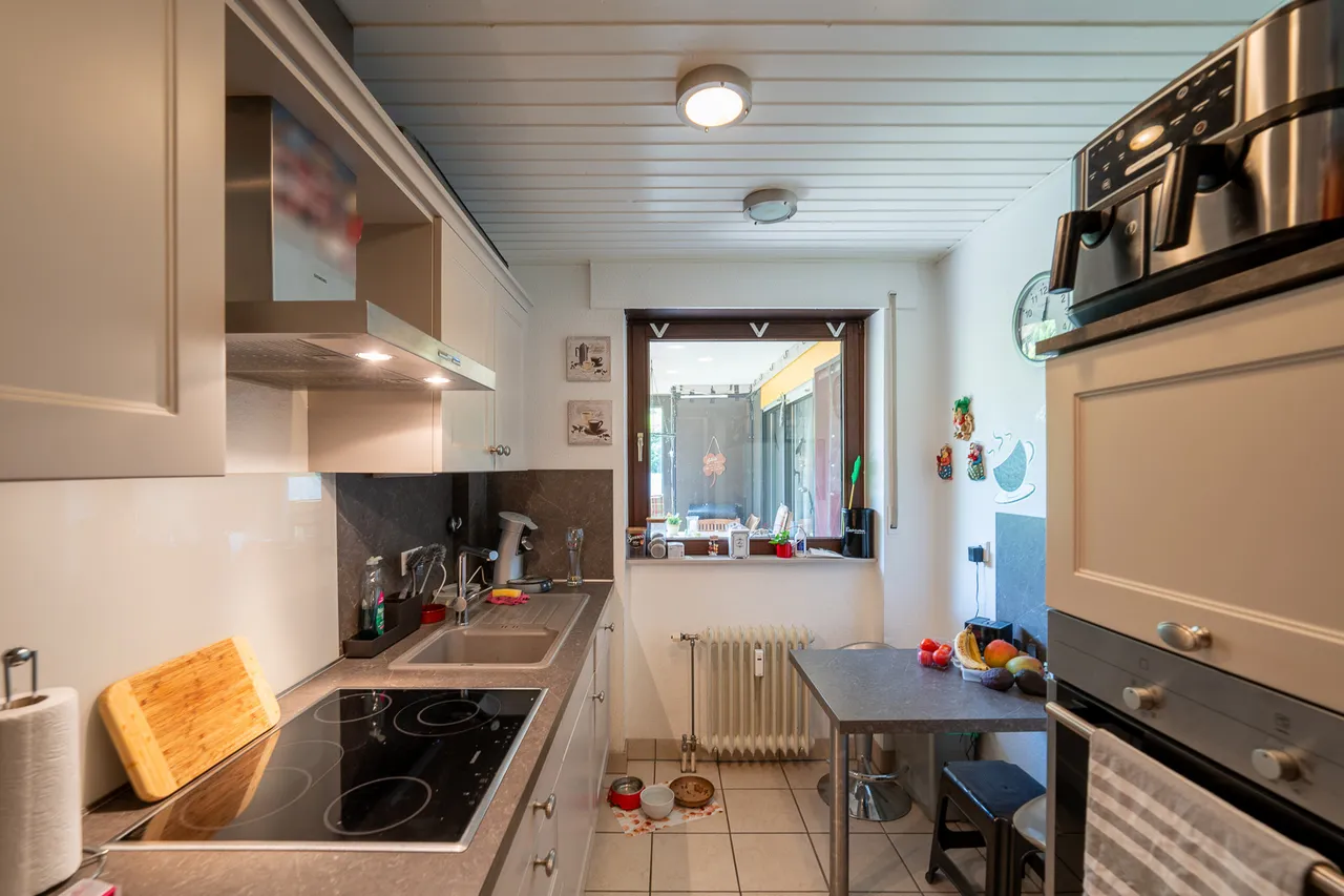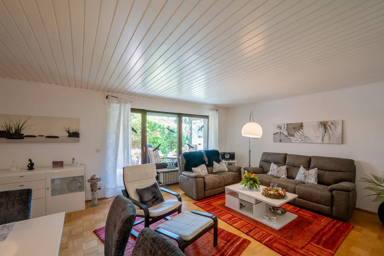 Der helle Wohnbereich öffnet sich zur sonnigen Terrasse – ein Platz zum Durchatmen, Genießen und Ankommen. Hier lässt sich der Alltag für einen Moment hinter sich lassen, ob allein oder in geselliger Runde.