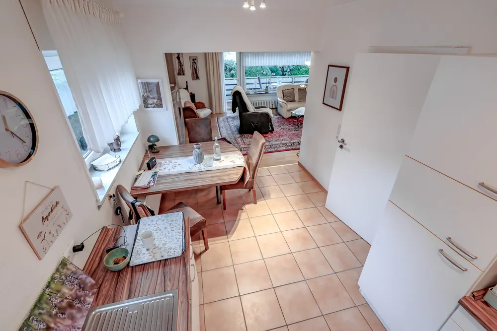 Die zum Wohnbereich hin offen gestaltete Küche inklusive Einbauküche präsentiert sich hell und funktional und bietet ausreichend Arbeits- und Stauraum. Das Badezimmer ist weiß gefliest, gepflegt und mit einer modernen, nahezu ebenerdigen Dusche ausgestattet. Praktische Haltegriffe sowie eine durchdachte Gestaltung sorgen für zusätzlichen Komfort.