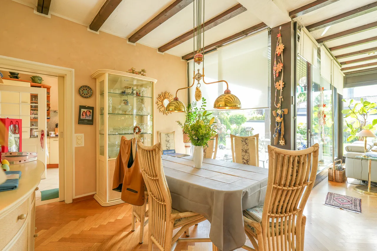 Der Wohn- und Essbereich ist lichtdurchflutet, mit sichtbarem Kamin als Herzstück – ein Ort für lange Gespräche, leise Abende und echte Begegnung. Die angrenzende Küche ist gepflegt und funktional – bereit für Ihre persönliche Handschrift.