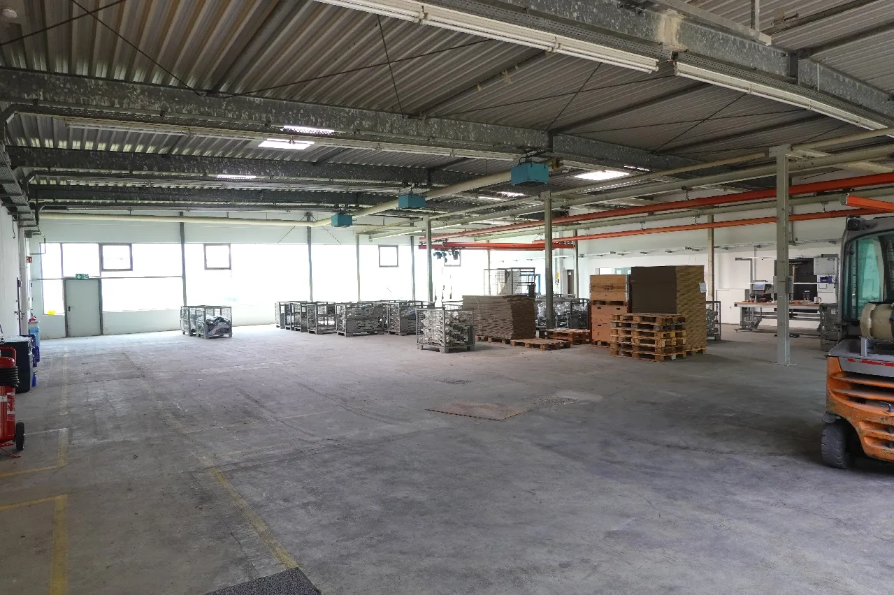 Über eine Schleuse ist der Bürotrakt direkt mit der ca. 654 m² großen Halle verbunden. Diese teilt sich in eine rund 452 m² große Werkshalle, sieben angrenzende Lagerräume, getrennte Umkleideräume mit Duschen sowie einen weiteren Pausenraum mit moderner Einbauküche auf. Zwei Zufahrten gewährleisten eine flexible Nutzung: Ein elektrisch steuerbares Sektionaltor sowie ein zusätzliches, doppelflügeliges Tor mit Zugang zu einer ca. 43 m² großen Lagerfläche. Eine Krananlage mit fünf verschiebbaren Trägern, jeweils mit einer Hebe-/Traglast von 250 kg, ergänzt die Ausstattung der Halle.