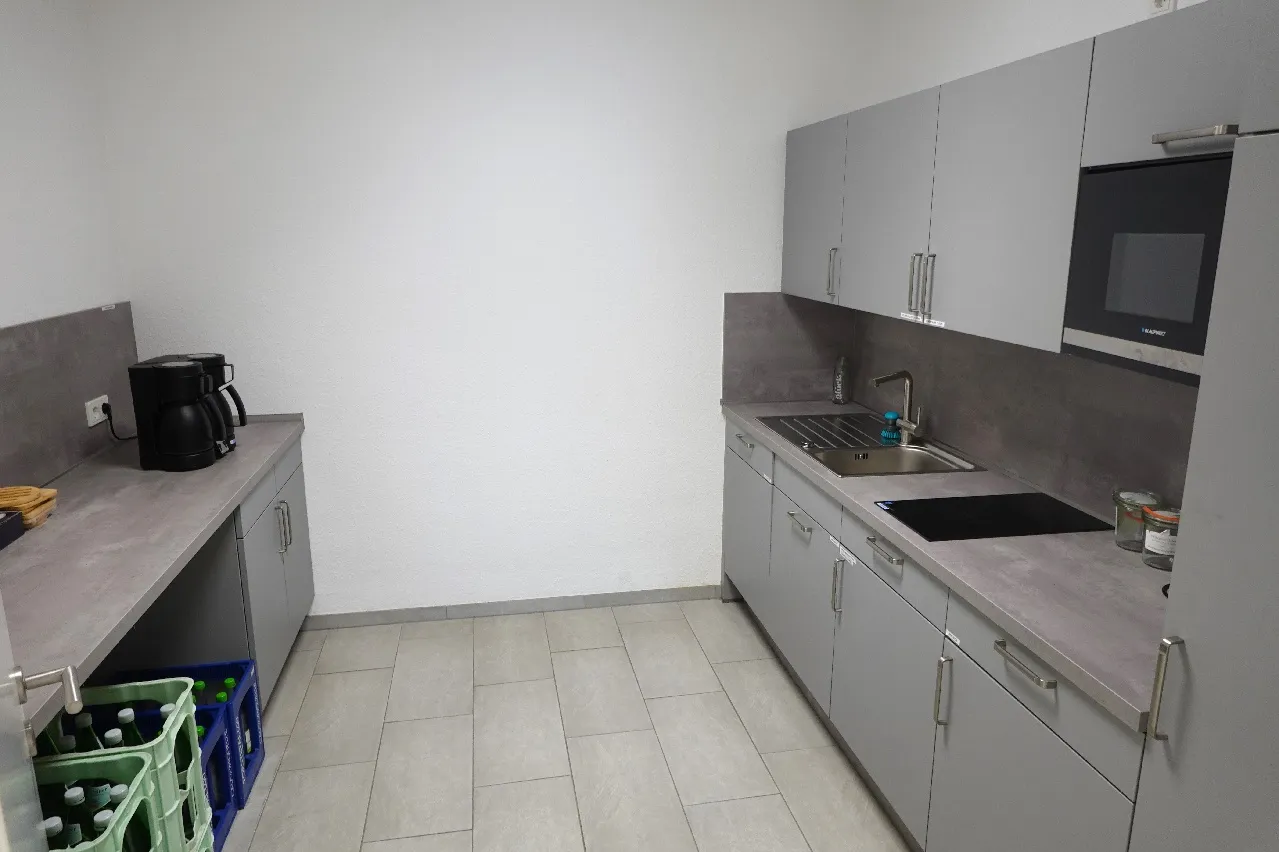 Über den separaten Zugang ist der Bürotrakt erreichbar. Hier betreten Sie zuerst einen Windfang mit Übergang in den zentralen Flur. Vom Flur links und rechts gelegen befinden sich jeweils auf der Fensterseite insgesamt 6 Büros. Auf der innenliegenden Flurseite liegen die modern gefliesten getrennten WC- Anlagen, ein ca. 15.5 m² großer Lagerraum sowie der bereits mit einer modernen Einbauküche ausgestattete Pausenraum.