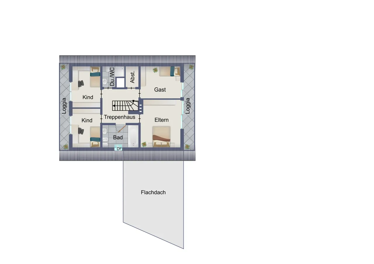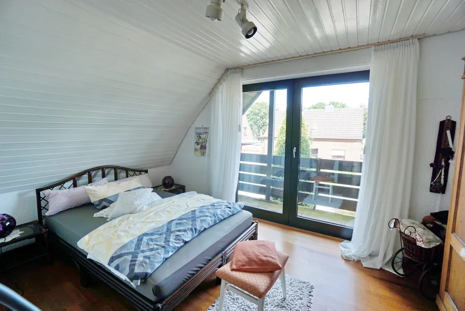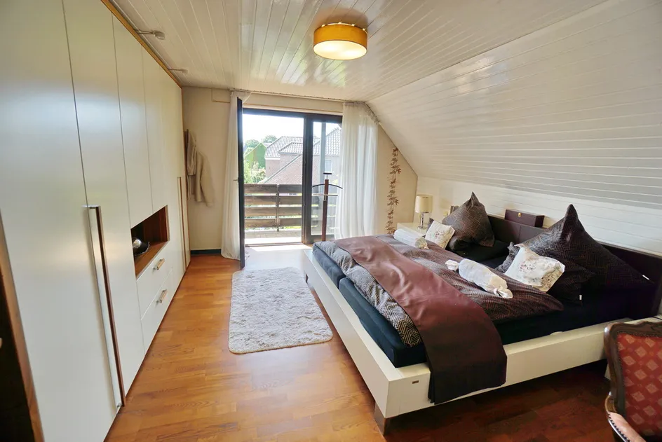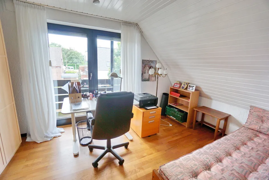 Das Obergeschoss bietet vier Schlafzimmer bzw. Büro oder Hobbyräume. Zwei Zimmer hiervon haben einen Zugang zur Loggia zum Garten.