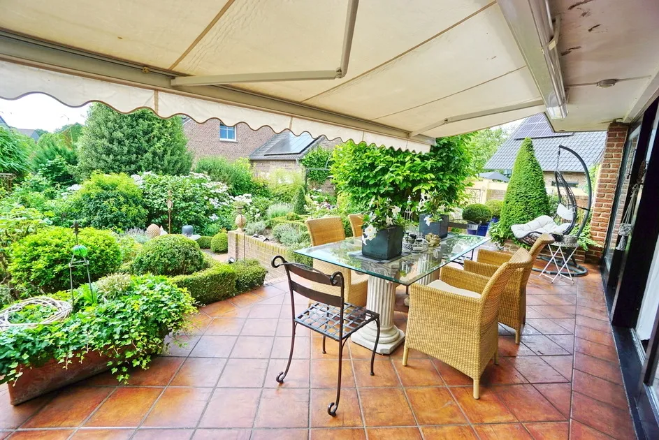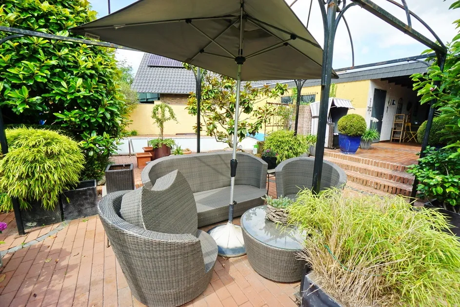 Die großzügige Terrasse und der wunderschön gestaltete Garten sind das absolute Highlight dieser Immobilie. Verschiedene Sitzgelegenheiten laden dazu ein, laue Sommerabende mit Freunden und Familie zu verbringen.