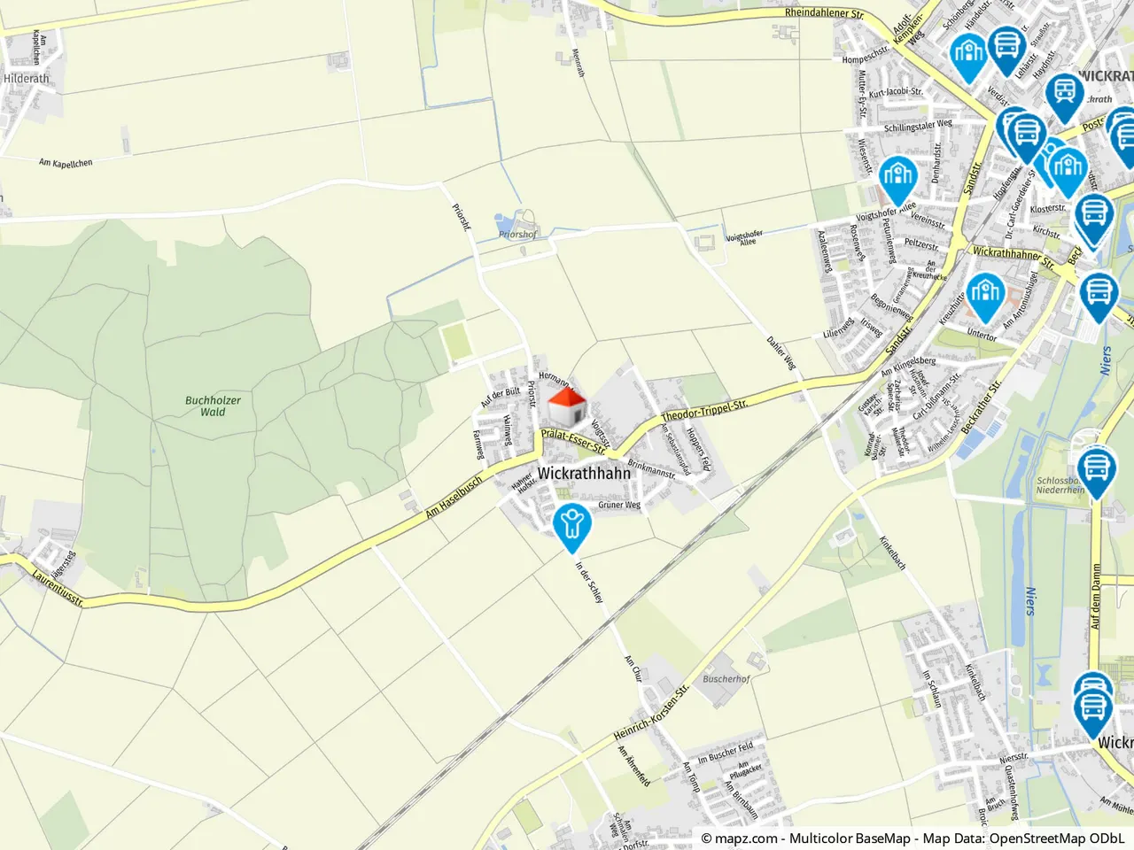 Die Immobilie befindet sich im Mönchengladbacher Stadtteil Wickrathhahn, einer ruhigen und ländlich geprägten Wohnlage mit hohem Erholungswert. Die Umgebung ist gekennzeichnet durch eine aufgelockerte Bebauung mit Ein- und Zweifamilienhäusern sowie weitläufigen Grün- und Freiflächen, die zu Spaziergängen, Fahrradtouren und Freizeitaktivitäten im Grünen einladen.