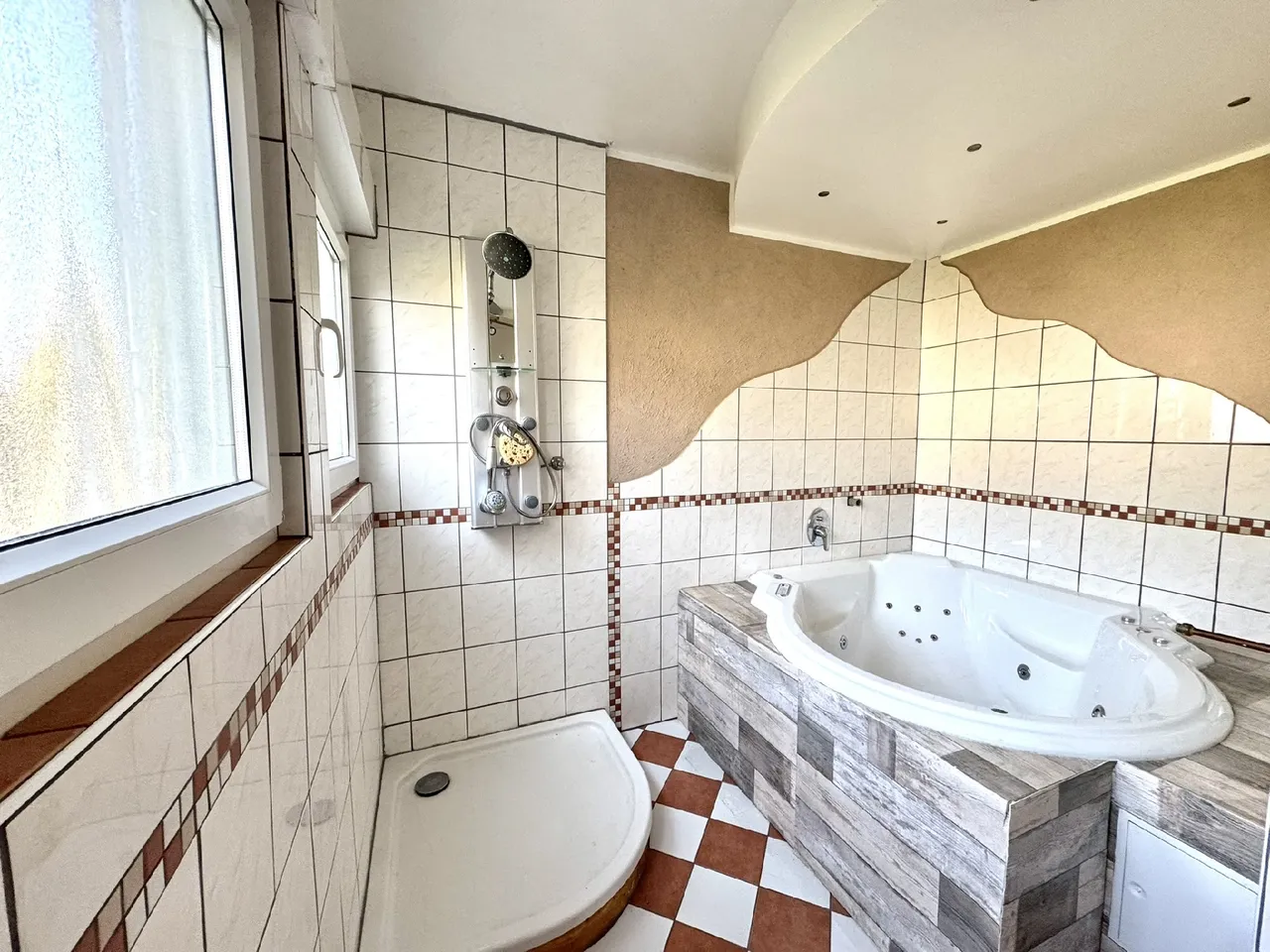 | Bad mit Dusche, Wanne, Fenster |