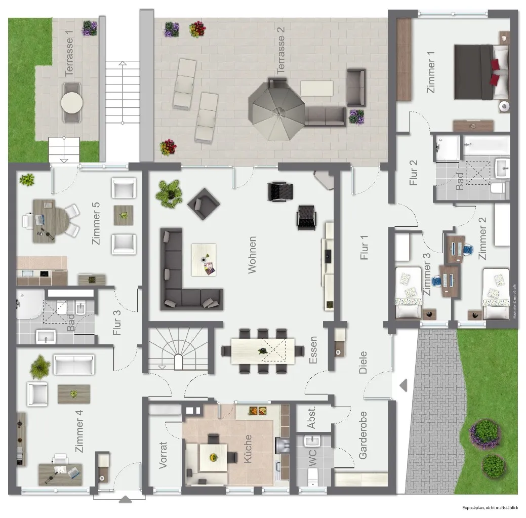 - großzügige Raumstruktur mit bis zu sechs möglichen Schlafräumen, ideal für Familien, Mehrgenerationenwohnen oder die Kombination von Wohnen und Arbeiten.