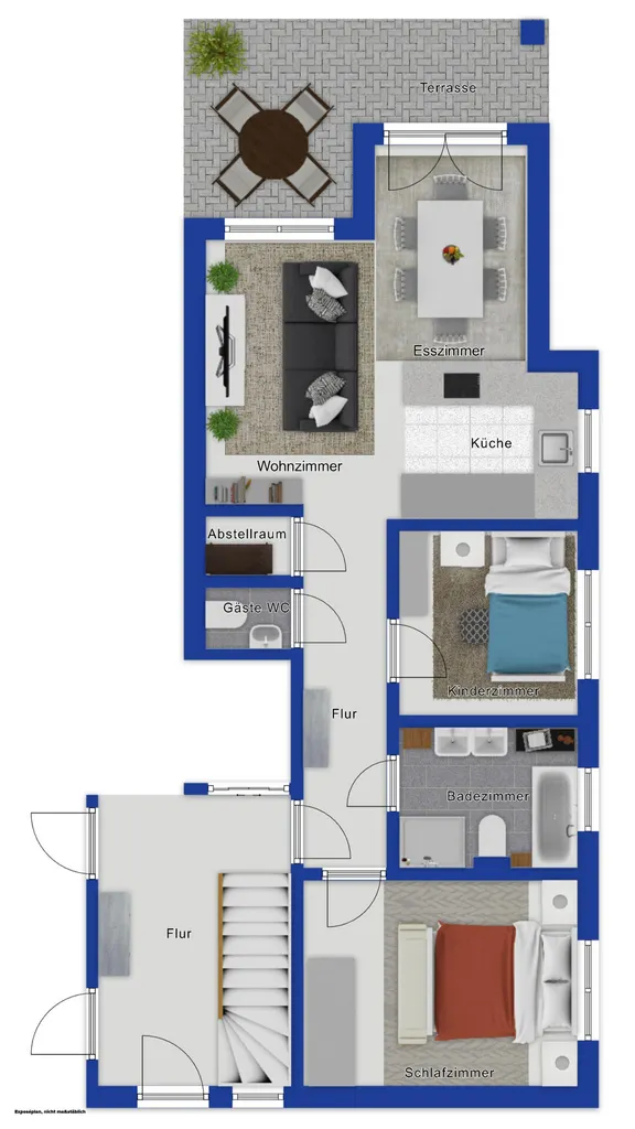 Diese großzügige Wohnung bietet einen offenen Wohn- und Essbereich mit einer modernen Küche. Von hier aus gelangen Sie auf die südlich ausgerichtete Terrasse, die mit einer Markise ausgestattet ist. Ein besonderes Highlight ist das Sondernutzungsrecht für den angrenzenden Gartenbereich.