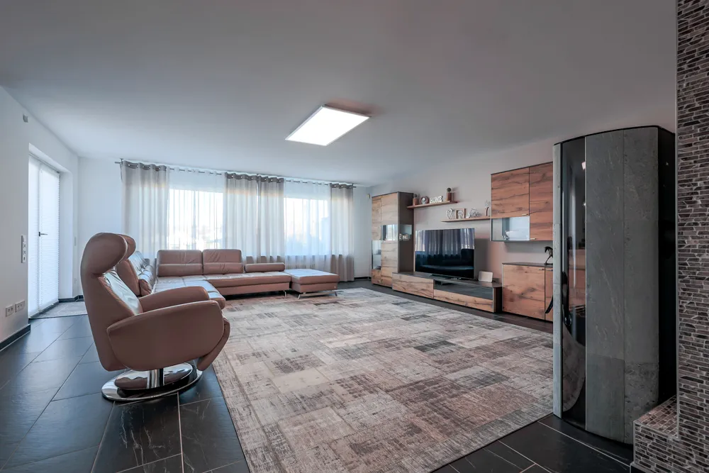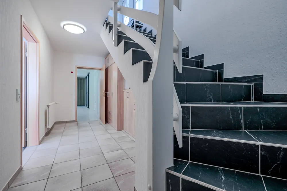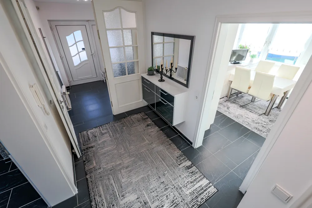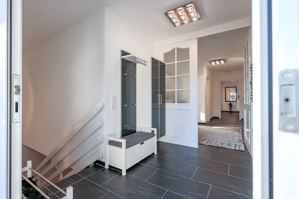 Sie parken Ihren PKW in der großzügigen Doppelgarage (rd. 37 m²) und gelangen stufenlos ins Erdgeschoss der Hauptwohnung. Hier finden Sie folgende Räumlichkeiten: