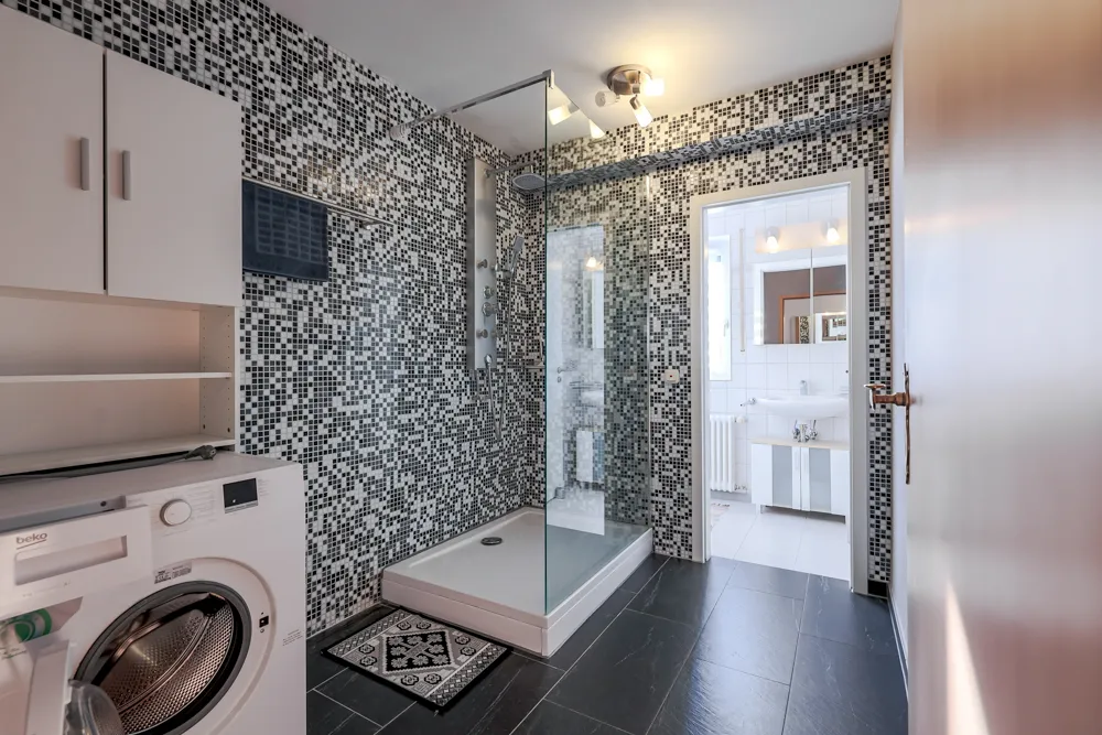 *Badezimmer mit großer Dusche, Waschmaschinenanschluss, WC, Fenster und Waschbecken