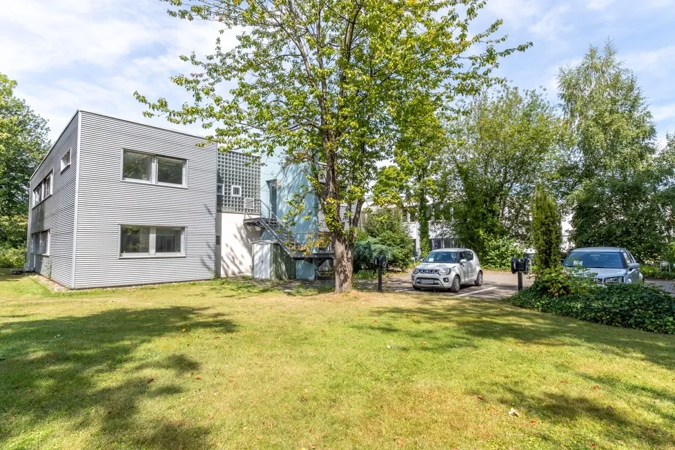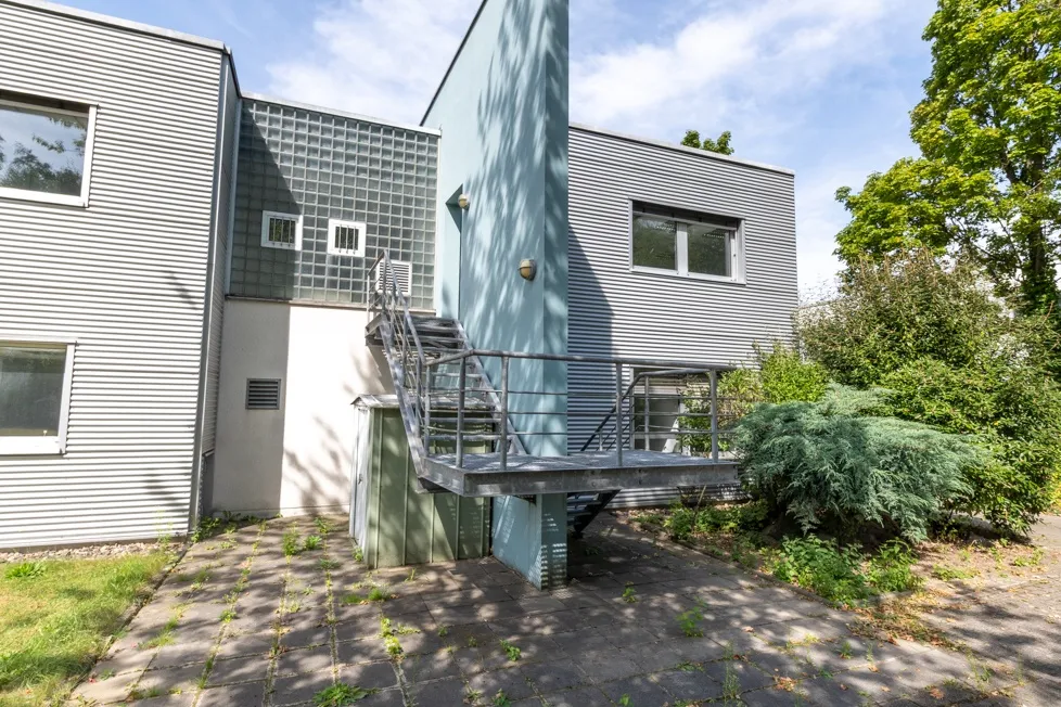 Zugang: Stufenloser Hauptzugang, rückseitig 2. Rettungsweg mit Außentreppenhaus und Zugang ins OG