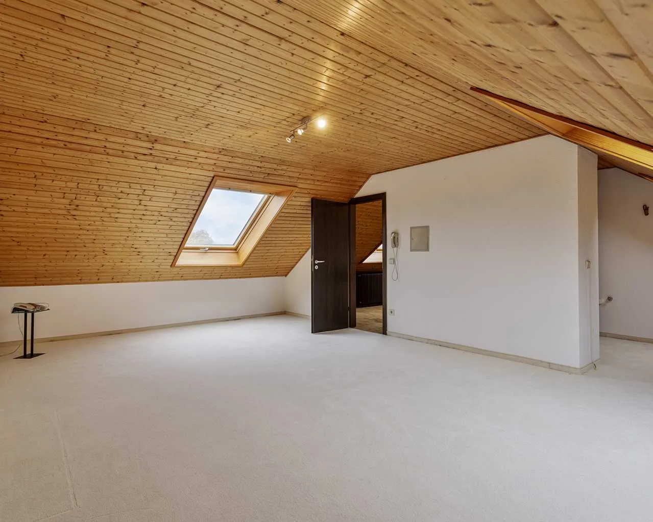 Wände und Decken: tapezierte und weiß gestrichen Decken- und Wandflächen, holzvertäfelten Schrägen im Dachgeschoss