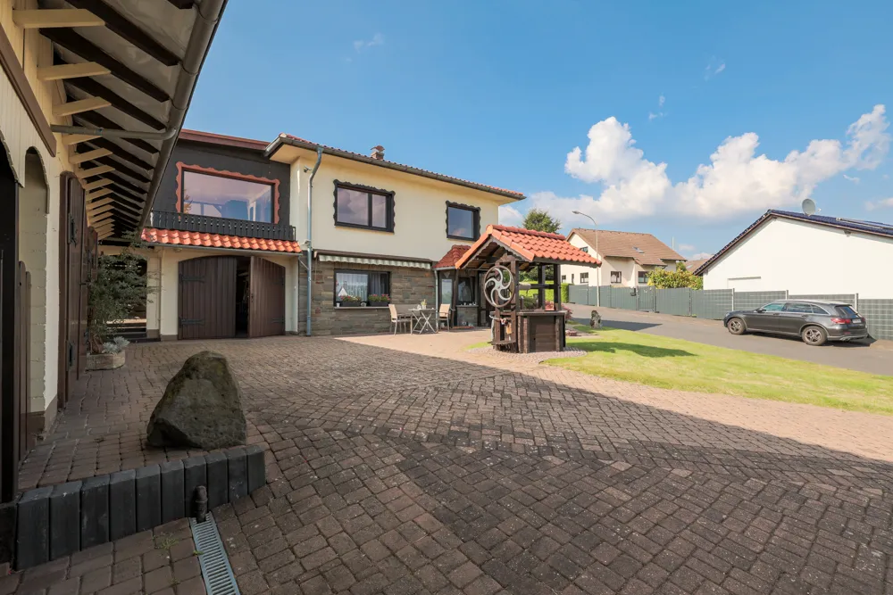 Die Einfahrt führt zu einem schön angelegten Hof direkt zum Haus und schafft sofort eine einladende Atmosphäre. Links neben dem Haus befindet sich ein separates Gebäude mit zwei Garagen und einem Carport. Ergänzt wird das Stellplatz-Angebot um eine innenliegende Garage, welche jedoch aktuell als Werkstatt umfunktioniert ist. Ein hübscher Brunnen im Hof verleiht dem Anwesen zusätzlichen Charme.