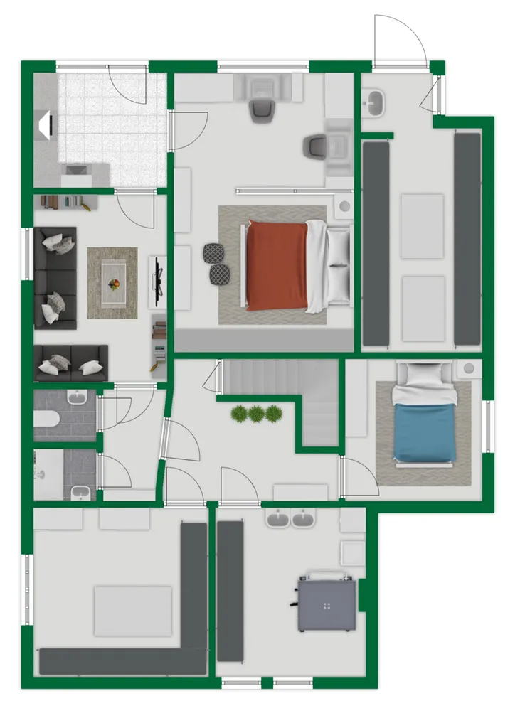 Der Zugang von der Hauptwohnung zum Garten ist sowohl vom Wohnzimmer als auch von einem weiteren Zimmer mittels einer Außentreppe sichergestellt.
