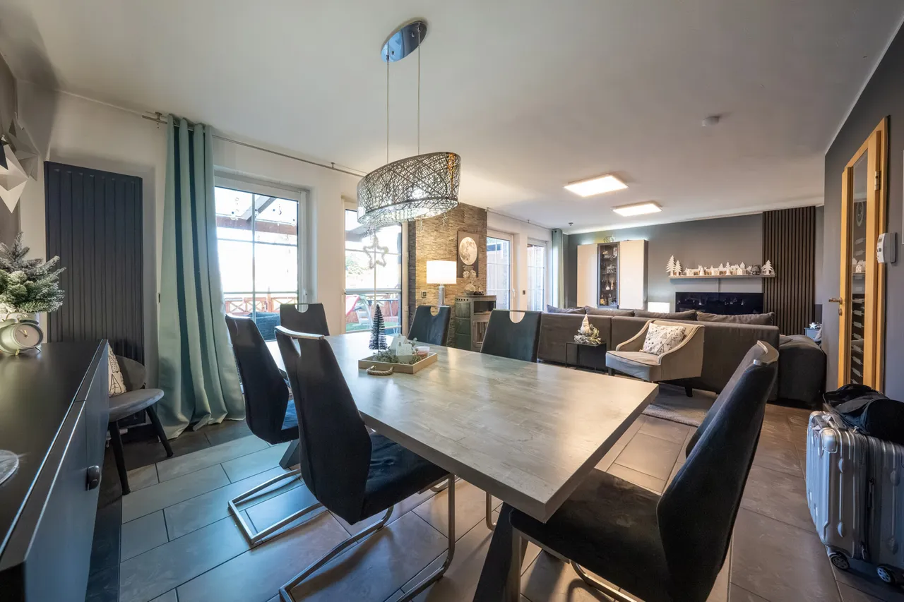 Bereits beim Eintritt setzt das Haus ein Statement: edler schwarzer Granit in Diele und Treppe verleiht eine elegante, zeitlose Atmosphäre. Der lichtdurchflutete Wohn- und Essbereich überzeugt mit Offenheit und Wärme – nicht zuletzt dank des gemütlichen Kaminofens, der für stimmungsvolle Abende das ganze Jahr über sorgt. Die moderne Küche integriert sich harmonisch und bietet viel Platz für Kochen, Genuss und gemeinsame Momente.
