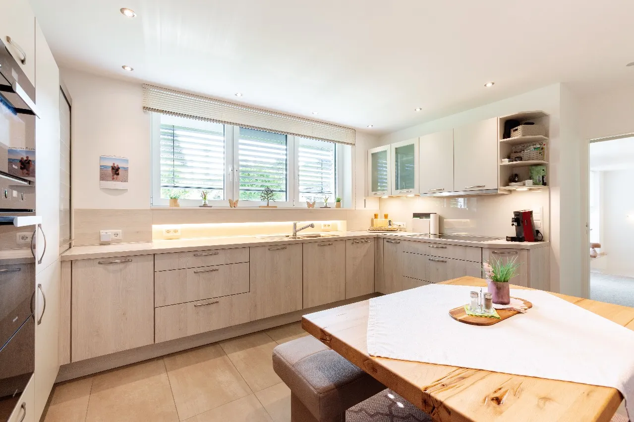 Alle Fenster wurden durch moderne, einbruchsichere Aluminiumfenster mit Kunststoffbeschichtung, Dämmverglasung und Einbruchsicherungen ersetzt. Ergänzt wird der Komfort durch zeit- und lichtgesteuerte Horizontallamellen sowie integrierte Insektenschutzsysteme je nach Raum unterschiedlich und stets funktional durchdacht.