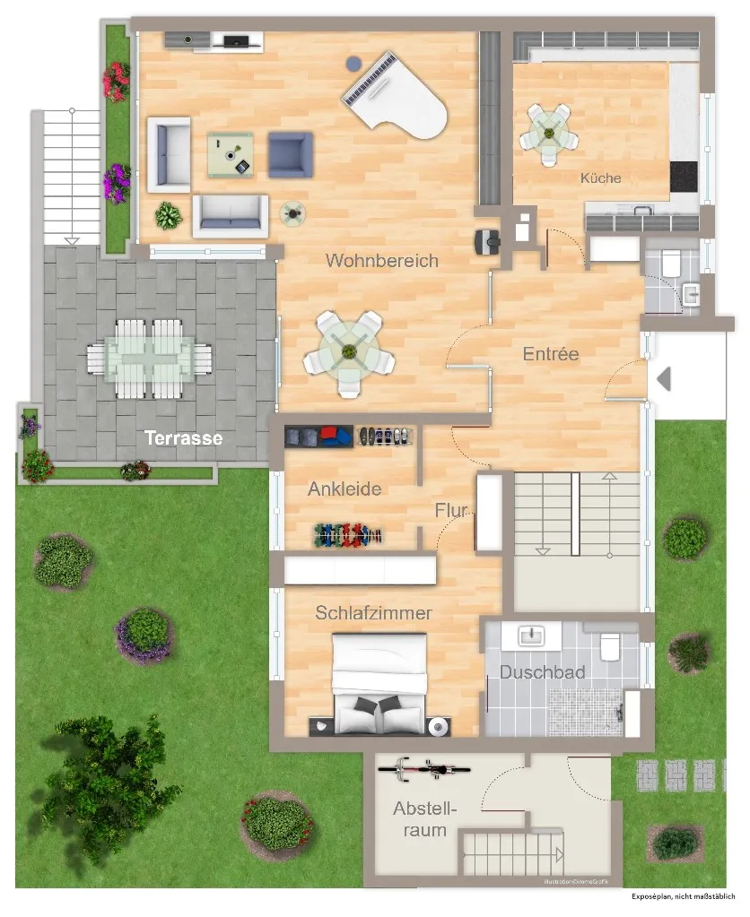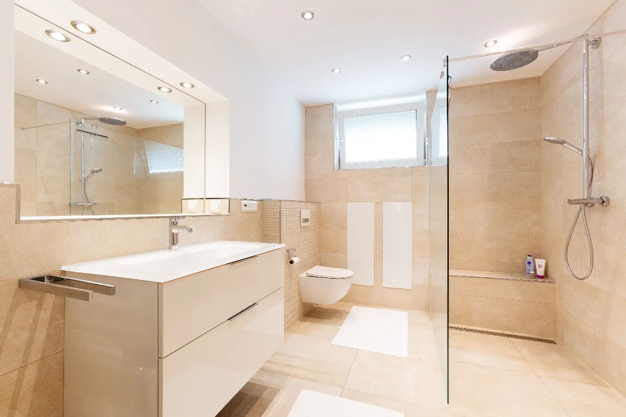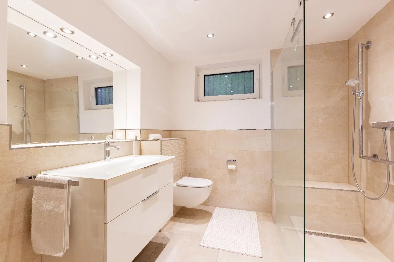 Der Sanitärbereich erfüllt höchste Ansprüche an Funktionalität und Komfort: Ein Gäste-WC im Eingangsbereich, ein barrierefreies Duschbad en Suite zum Schlafbereich sowie ein weiteres, nahezu baugleiches barrierearmes Duschbad im Gartengeschoss ideal auch für einen potenziellen Einliegerbereich. Die Bäder sind zusätzlich zur Zentralheizung mit elektrischer Fußbodenheizung ausgestattet und wurden im Zuge einer Kernsanierung 2018 modernisiert.