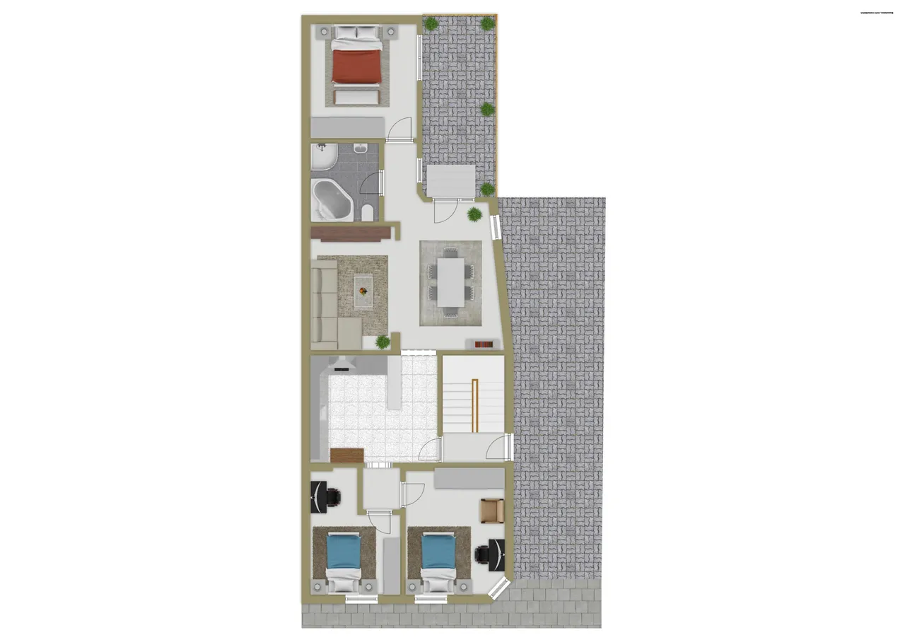 Die Erdgeschosswohnung überzeugt durch drei flexibel nutzbare Zimmer, die sich ideal als Schlaf-, Arbeits- oder Gästezimmer gestalten lassen. Direkt am Eingangsbereich befindet sich die offene Küche, die nahtlos in den hellen Wohn- und Essbereich übergeht. Von hier aus gelangen Sie auf eine kleine Terrasse – ein perfekter Rückzugsort für entspannte Stunden im Freien. Das innenliegende Badezimmer ist modern ausgestattet und bietet sowohl Badewanne als auch Dusche.