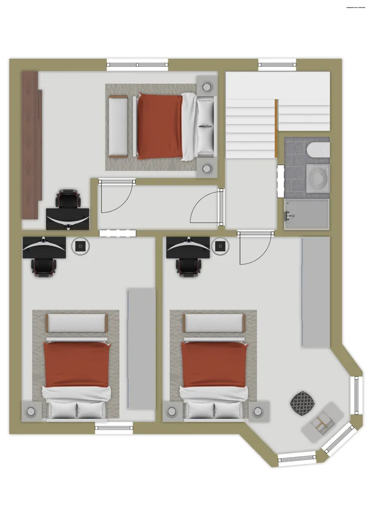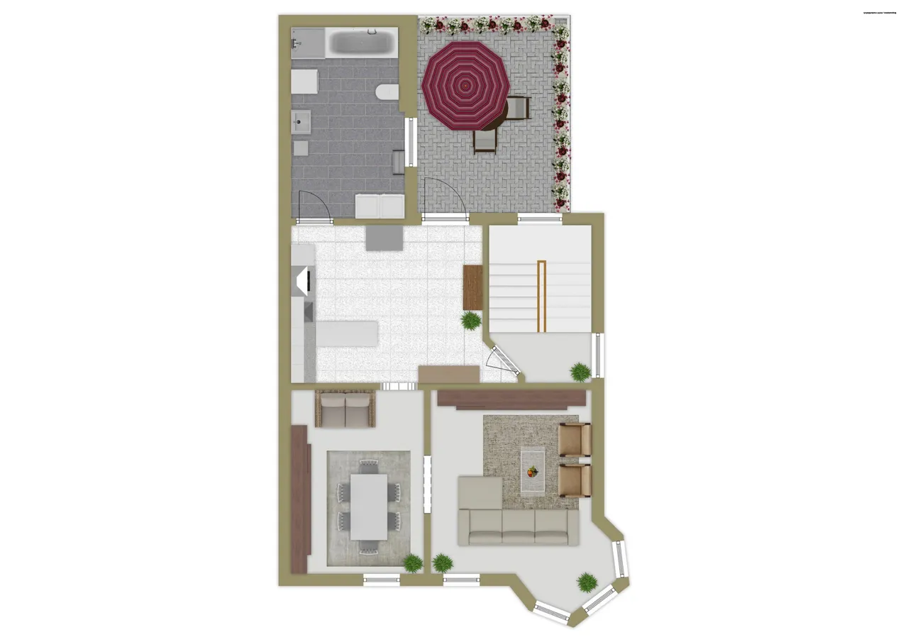 Die Obergeschosswohnung erstreckt sich über zwei Etagen und beeindruckt durch eine durchdachte Raumaufteilung. Im 1. Obergeschoss betreten Sie die Wohnung direkt in die offene Küche mit angrenzendem Wohn- und Essbereich. Von der Küche aus haben Sie direkten Zugang zum Balkon – ideal für sonnige Frühstücke oder gemütliche Abende im Freien. Das Badezimmer ist ebenfalls mit Badewanne und Dusche ausgestattet. Im Dachgeschoss befinden sich drei weitere, flexibel nutzbare Zimmer sowie ein kleines Bad mit Dusche, die vielseitige Nutzungsmöglichkeiten für Familie, Hobby oder Arbeitsbereiche bieten.